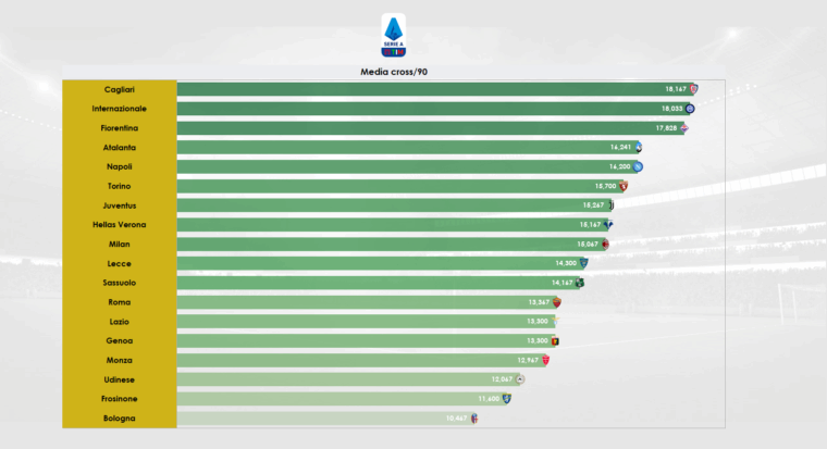 Prima di vedere le principali differenze sul modo di intendere il calcio, c’è un punto che unisce Cagliari e Atalanta ed è quello degli attacchi da zone laterali. I numeri rendono chiaro come dalle corsie esterne si sviluppi una buona parte del piano offensivo delle due squadre. Il Cagliari è la prima formazione per cross effettuati in media nei 90′, con 18.16 a partita. L’ Atalanta è invece quarta con 16.24, dietro solo ai rossoblù, all’Inter e alla Fiorentina. A dimostrazione di una produzione nella metà campo avversaria che poggia proprio sulle fasce, con giocatori come Nández da una parte, Ruggeri e Zappacosta dall’altra, che spesso per questo finiscono per essere protagonisti.