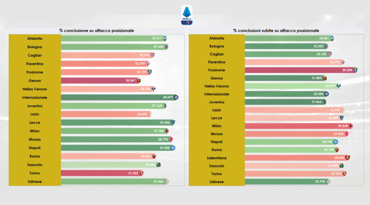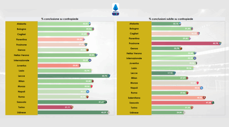 Dall’altra parte però, come dimostrato dal grafico che seguirà tra qualche riga, la scelta di un baricentro basso e compatto in fase di non possesso fa preferire al Cagliari le ripartenze come arma per far male agli avversari. La percentuale di conclusione sul contropiede dei rossoblù è del 31%. L’Atalanta ha un dato migliore di un punto percentuale, ma soprattutto è molto brava nel gestire le situazioni avversarie di contrattacco rapido: è appena del 22.13% il valore fatto registrare sulla percentuale di conclusioni subite su contropiede, lontano da quello del Cagliari che invece fa molta nel difendere a campo aperto (36.22%, meglio solo di Frosinone, Salernitana, Sassuolo e Napoli).