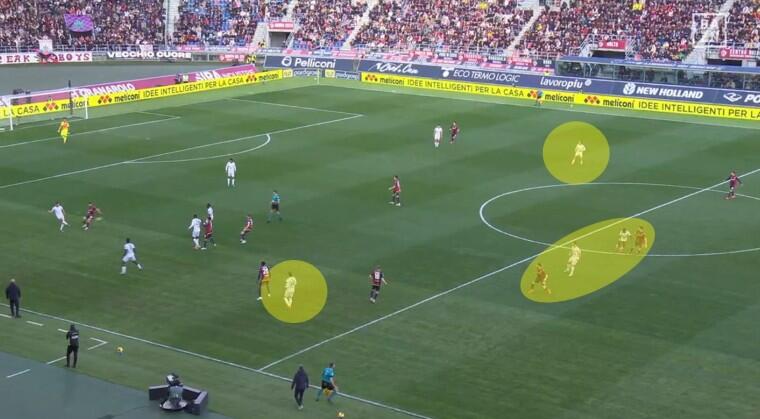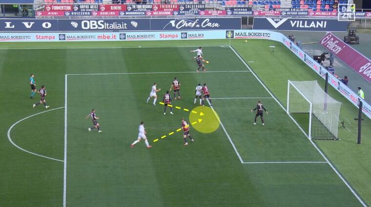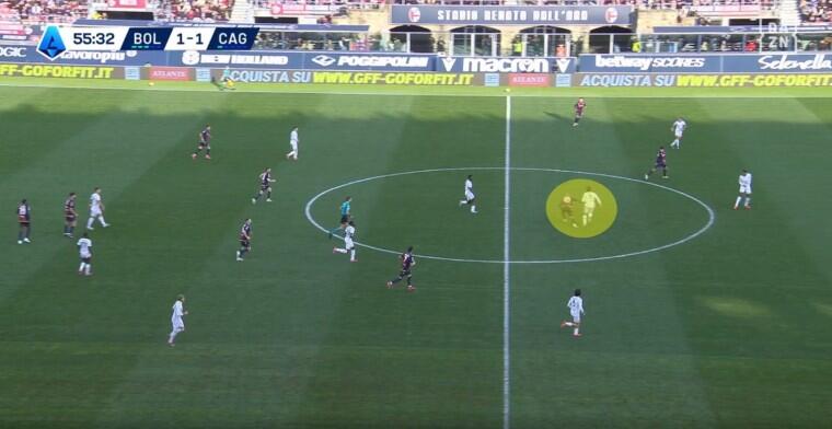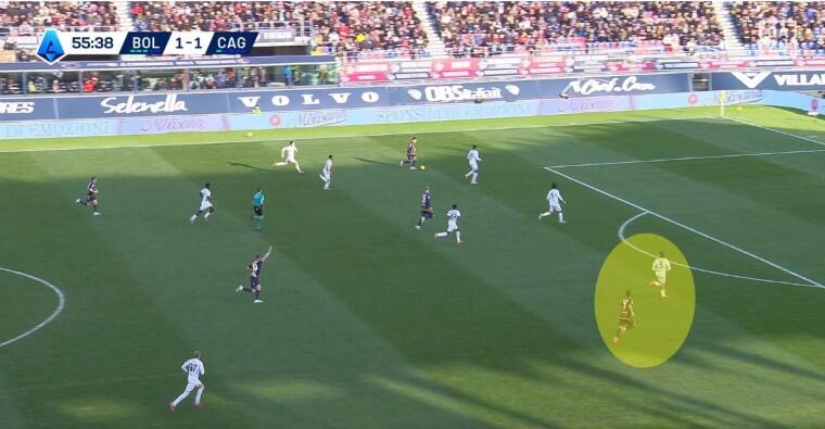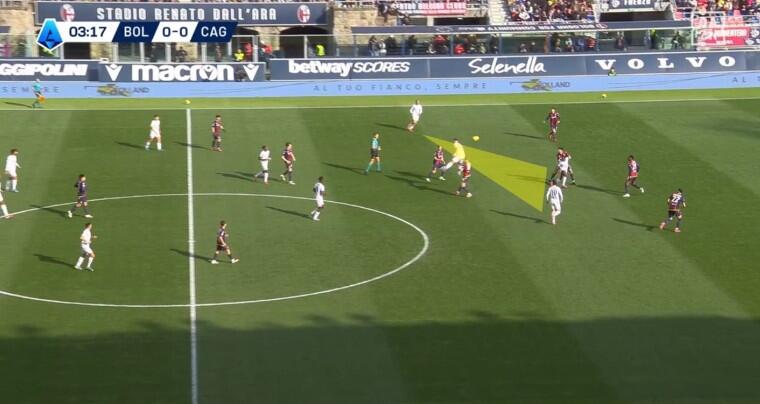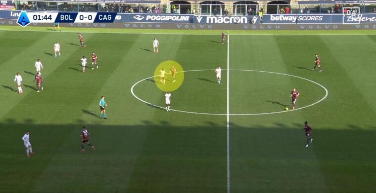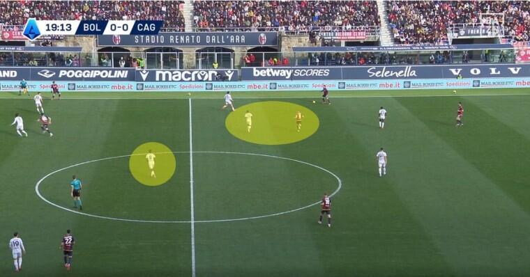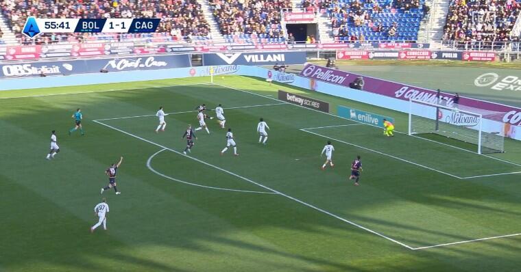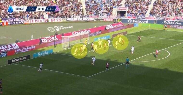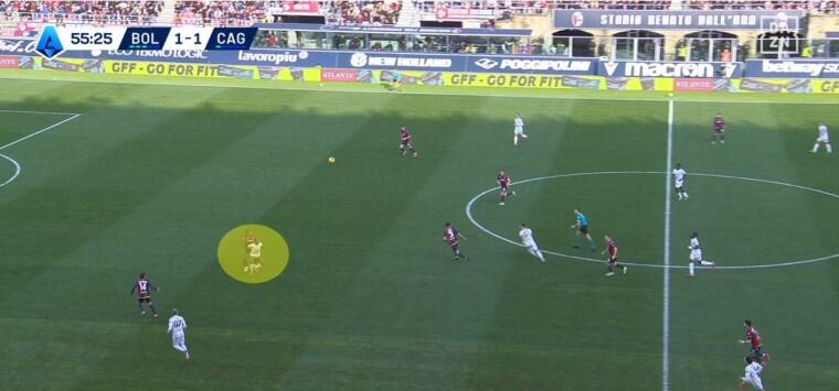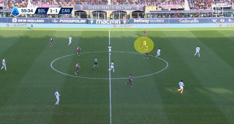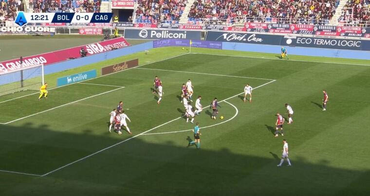 Fisiologicamente si sono viste situazioni di pressione del Bologna nella zona offensiva, ma con un Cagliari che è stato pronto nell’abbassarsi compatto e creare densità nella zona appena fuori dall’area di rigore, evitando imbucate e lasciando che la squadra di Italiano provasse ad andare al cross con gli esterni senza particolare successo. La concentrazione e la disposizione dei reparti ha aiutato nella conquista delle seconde palle, il poco spazio ai fronzoli ha tolto al Bologna l’arma del recupero del pallone nella trequarti avversaria.