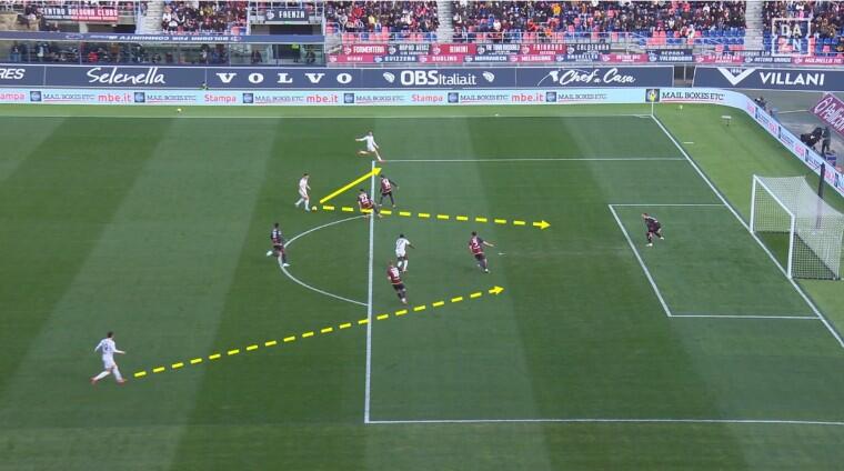 Odgaard, una volta superato Luperto, trova in Castro l’appoggio sempre all’altezza della metà campo e Zappa decide, correttamente, di scalare sull’argentino lasciando libero il suo avversario diretto Cambiaghi sull’esterno. Il problema (e l’errore del terzino rossoblù) è che quando si compiono scelte di questo tipo le opzioni sono due: riuscire a togliere il pallone a Castro o, in alternativa, spendere il fallo e il probabile cartellino giallo conseguente. Lasciarsi superare senza fermare l’azione porta alla terza opzione da evitare senza se e senza ma, ossia il pallone in verticale su Cambiaghi che, a quel punto, scompensa completamente la fase difensiva creando inferiorità numerica. Da notare sul lato sinistro della difesa la distanza tra Augello e Orsolini e, soprattutto, come il terzino rossoblù non metta mai gli occhi sull’esterno del Bologna.