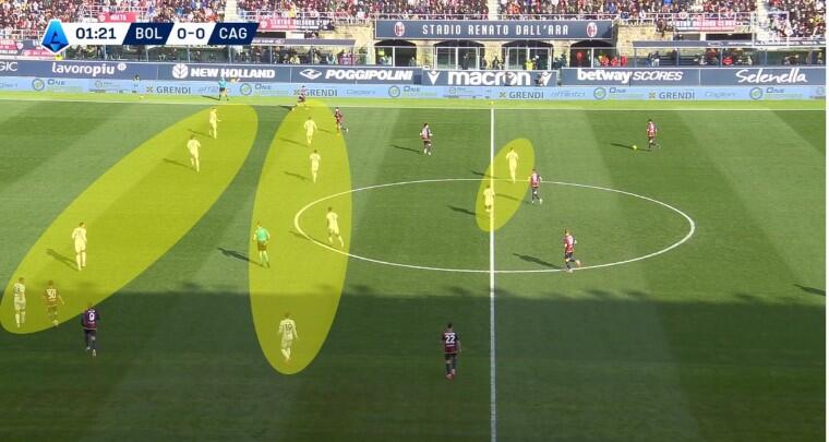 La rinuncia al centrocampo a tre ha portato l’allenatore del Cagliari a scegliere la strada di un classico 4-4-2, con i reparti corti e con un’elevata attenzione tattica. Confermata rispetto alla gara contro la Juventus la decisione di attendere gli avversari, con la copertura dei corridoi verticali e dei mezzi spazi e una pressione non aggressiva, ma più improntata alla chiusura di linee di passaggio e fonti di gioco. Rispetto alla gara di andata i rossoblù non hanno provato a giocare con le armi del Bologna – tecnica e costruzione dal basso – ma piuttosto hanno utilizzato più i palloni lunghi e, più di ogni altra cosa, allontanato il rischio dei recuperi alti da parte degli uomini di Vincenzo Italiano, caratteristica fondante del gioco degli emiliani.