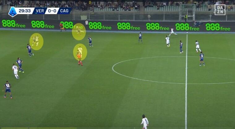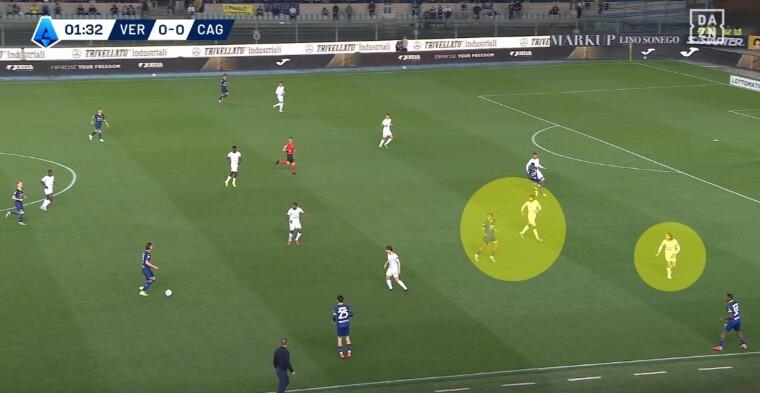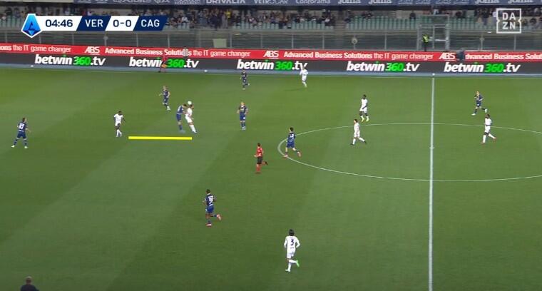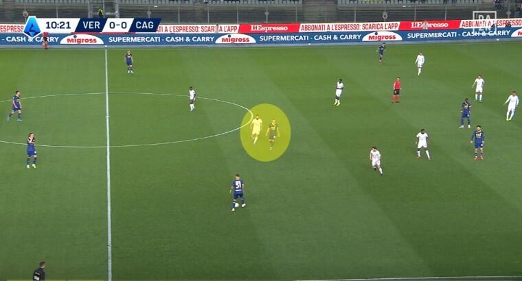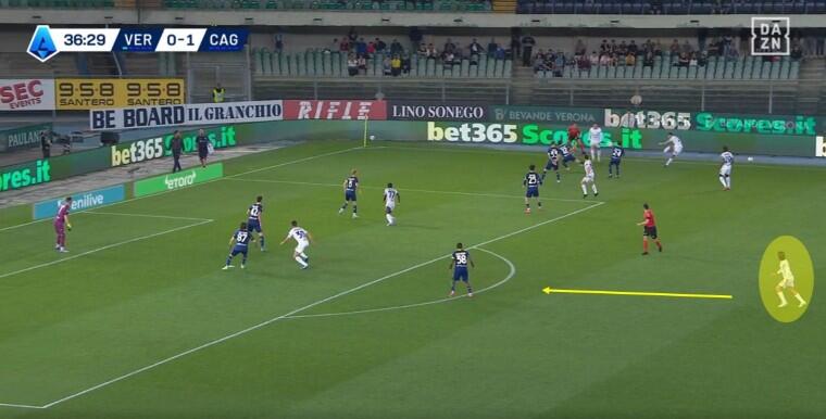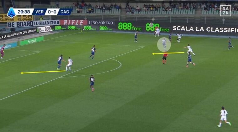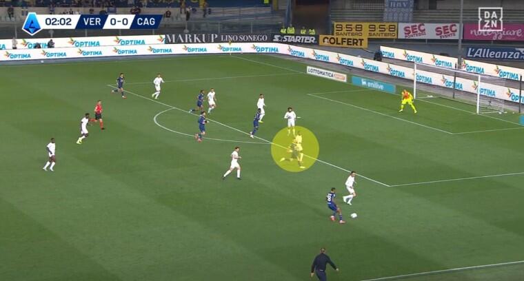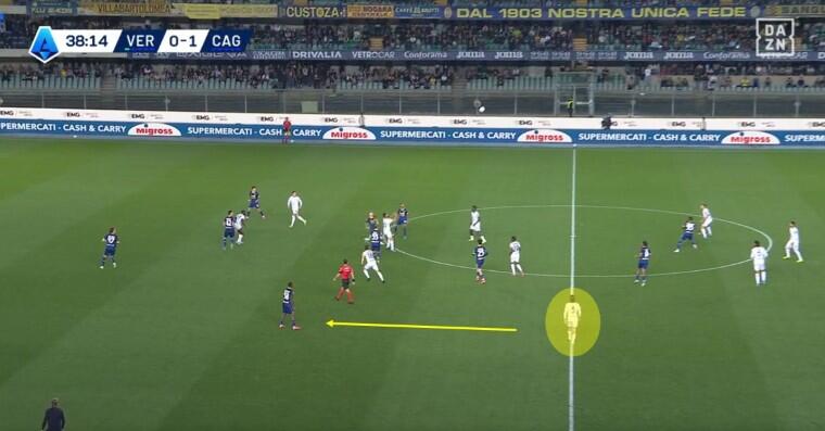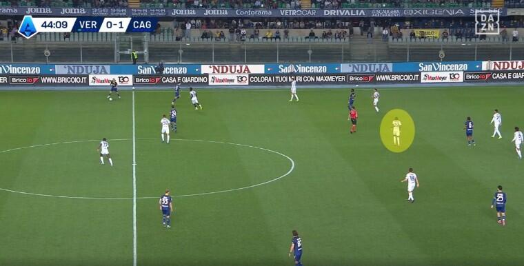 La più classica delle giocate del Verona in questo campionato è stata quella di attirare centralmente gli avversari per poi cercare rapidamente lo sfogo sulla corsia di destra del proprio attacco, utilizzando le caratteristiche del suo esterno Tchatchoua. Velocità sopra la media e capacità di attaccare lo spazio sul lungo che, al netto di difficoltà tecniche al momento del cross, sono state spesso il grimaldello per aprire le difese. In questo contesto Nicola ha scelto in maniera perfetta di chiedere ad Augello una prestazione diversa rispetto al solito. Meno propositivo e più attento, tanto che come dato da prendere come esempio l’esterno mancino del Cagliari ha effettuato appena 4 cross in 90 minuti, una media di uno ogni 22,5 minuti contro quella stagionale pari a uno ogni 12,5 minuti.