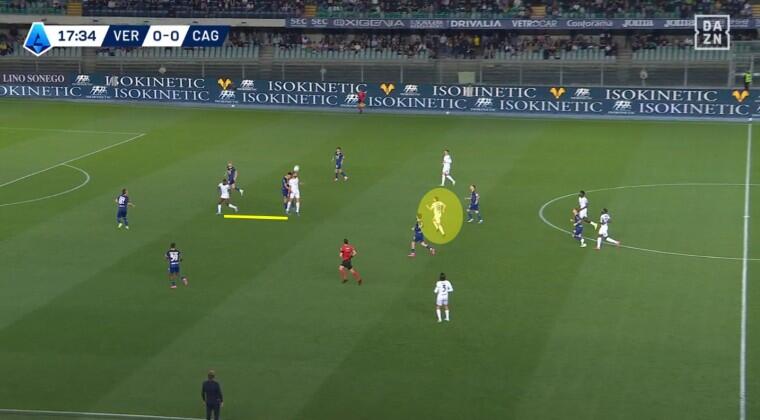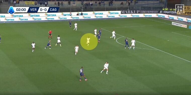 La chiave della fase offensiva è stata senza dubbio la presenza di Pavoletti al posto dello squalificato Piccoli. Caratteristiche diverse nonostante ruolo simile, perché se il titolare assente a Verona garantisce gestione dei palloni anche bassi e un lavoro da riferimento con anche qualità nell’attacco della profondità , il livornese è più abile nel gioco aereo e più uomo d’area, ma con la capacità di giocare di sponda per favorire l’attacco dello spazio dei compagni. La disposizione delle due punte è stata dunque verticale, con Pavoletti a ricevere i palloni lunghi e Luvumbo a scivolare alle sue spalle per raccoglierli.