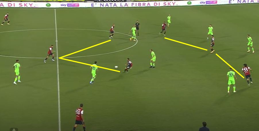 Il gol del vantaggio è un altro esempio di questo atteggiamento volto a spingere in verticale da parte delle ali. Una, Joao Pedro, parte più centrale per poi allargarsi mentre l’altra, Sottil, fa il movimento opposto dall’esterno a chiudere verso il centro dei sedici metri.