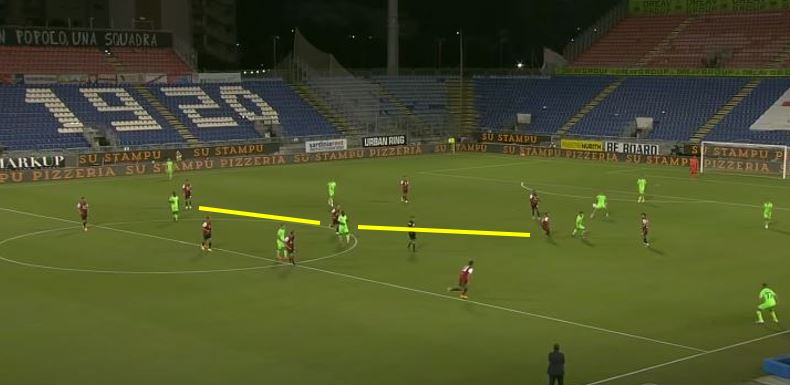 La richiesta di alternare verticalità a ricerca dello spazio tra le linee è evidente in questo fotogramma della gara contro la Lazio. Joao Pedro e Sottil infatti non scappano, ma vengono incontro in una zona più centrale trovando tra difesa e centrocampo un’area favorevole per ricevere palla. Gli esterni d’attacco difficilmente giocano larghi, nel caso del numero 10 brasiliano diventa ancora più importante questa richiesta che lo aiuta a giocare più vicino al centravanti e dunque alla zona dove può essere pericoloso. Pensando a un Cagliari con Ounas, la posizione a piede invertito favorisce ancora di più la ricerca di questo movimento dall’esterno verso il centro per poi colpire verso la porta o cercare il taglio del compagno sul lato opposto.
