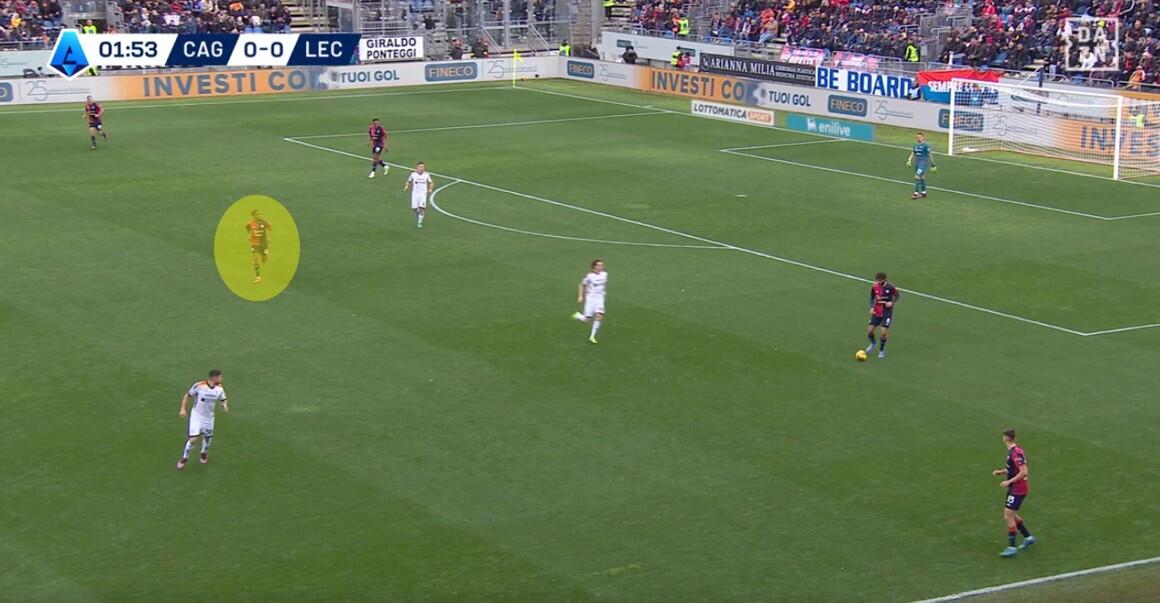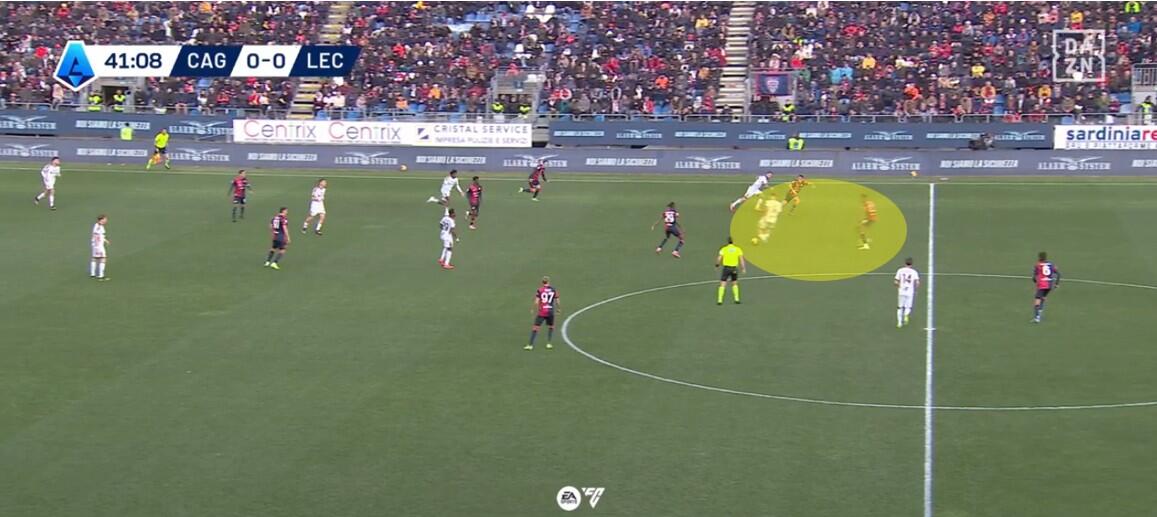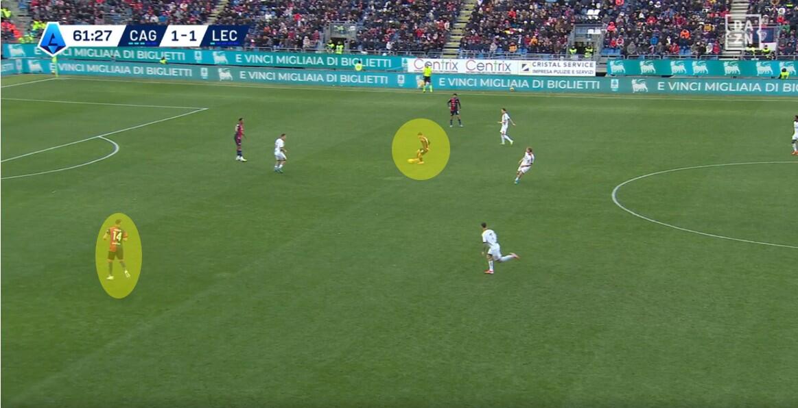 La rete di Pierotti nasce appunto da un’uscita dalla linea di Krstovic seguito alto da Mina. L’attaccante del Lecce ha scaricato su Dorgu mentre Tete Morente andava in verticale indirizzando la giocata sempre di Dorgu alle spalle di Zappa. Nel frattempo Krstovic, Helgason e Pierotti andavano a supportare l’azione dell’esterno spagnolo, finendo per creare un 3 contro 2 nell’area del Cagliari mentre Zappa provava a contrastare il pallone orizzontale di Morente. Un’azione conseguenza dell’atteggiamento propositivo ma poco aggressivo degli uomini di Nicola e che troverà la cura nei cambi dopo appena otto minuti della ripresa.