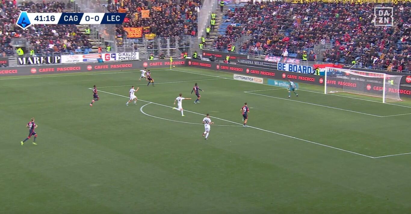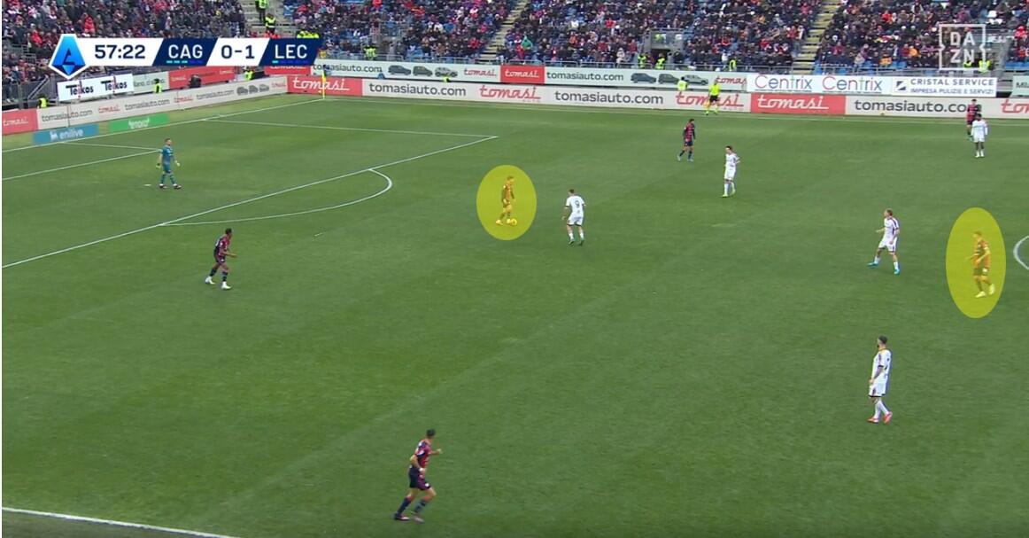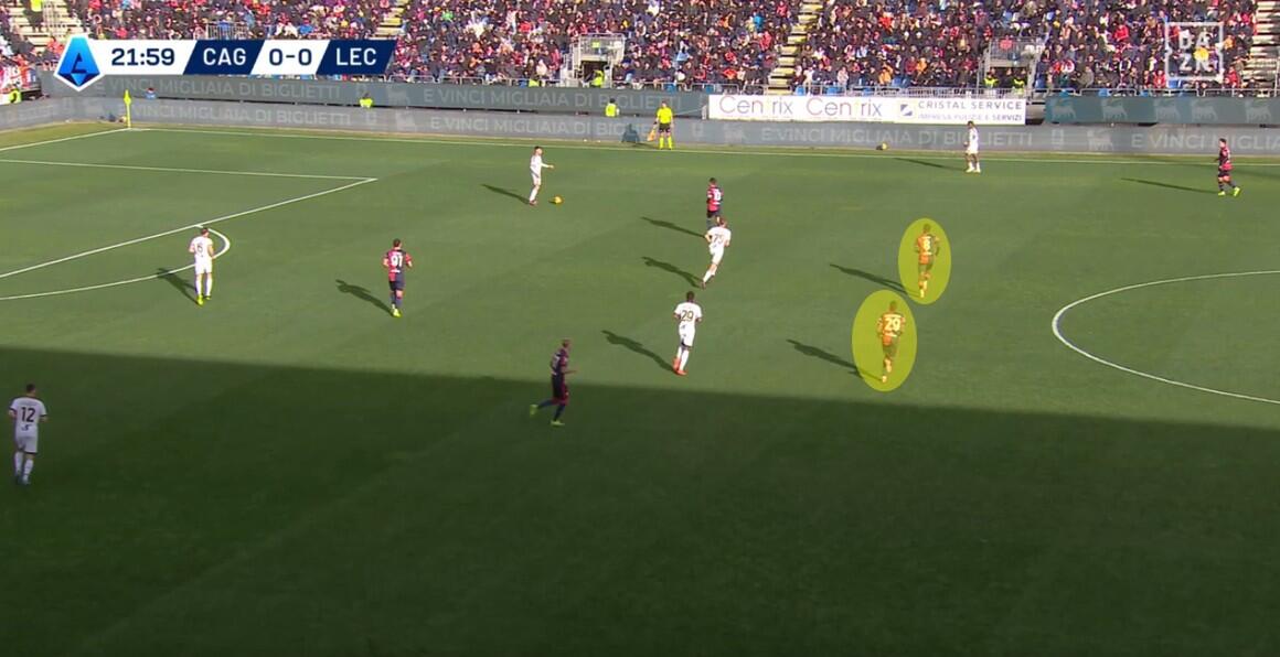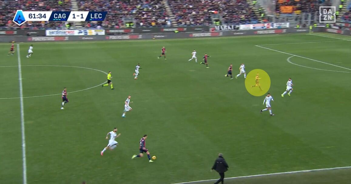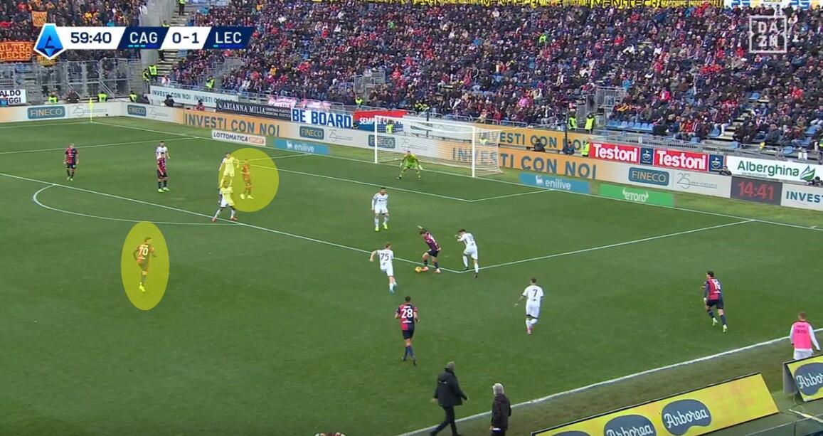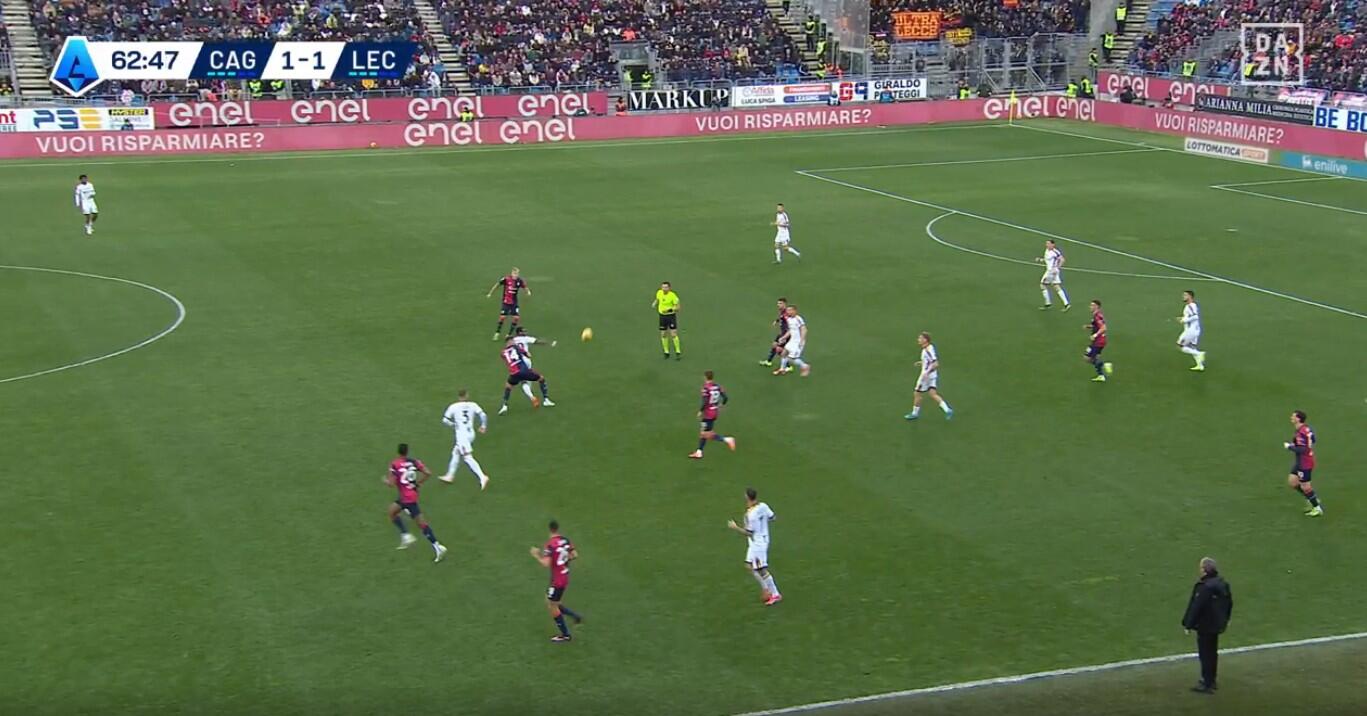 L’ingresso di Deiola, Marin e Gaetano cambia l’inerzia della gara, ma soprattutto modifica l’atteggiamento del Cagliari, con un pressing più forte e meno cura della chiusura delle linee di passaggio, ma maggiore intensità nell’uomo contro uomo e nella creazione di densità nella zona di possesso del Lecce. La dimostrazione nella quantità di giocatori rossoblù spesso nell’area del pallone, una concentrazione spesso elevata che lasciava poco spazio per le uscite ai salentini. Gestione favorita anche dai cambi di Giampaolo che con l’uscita di Krstovic e soprattutto quella di Pierotti non ha più avuto la valvola di sfogo fisica e tecnica per limitare la pressione dei padroni di casa.