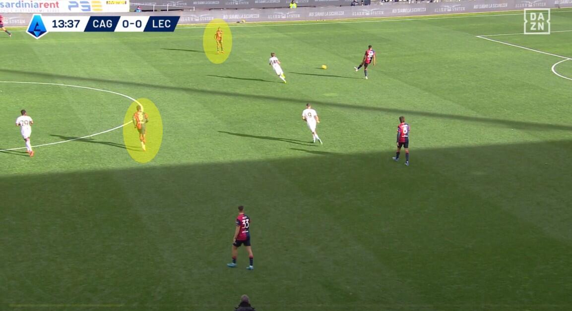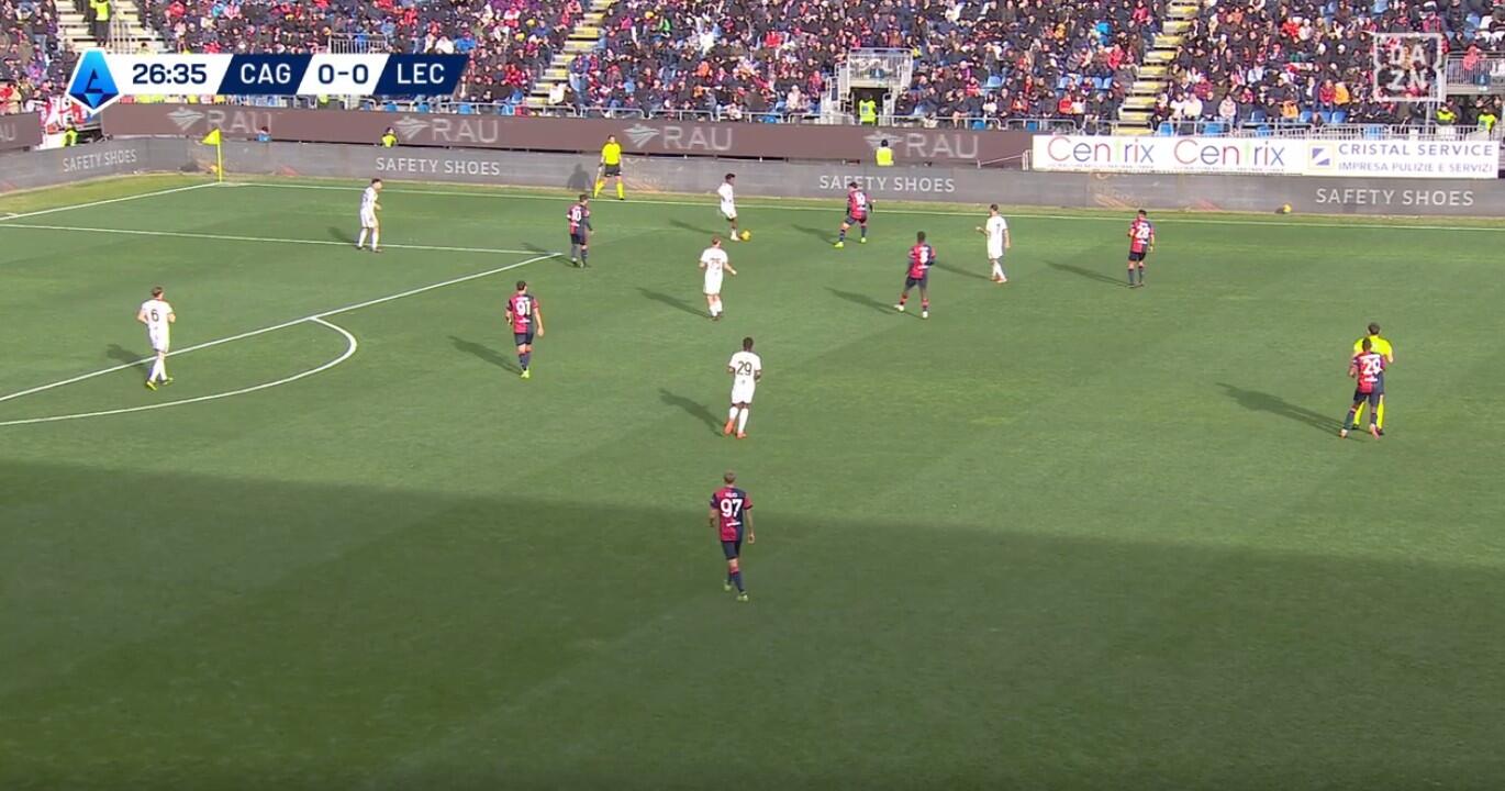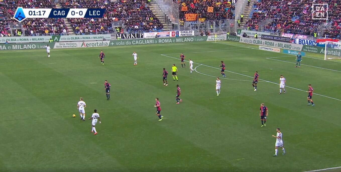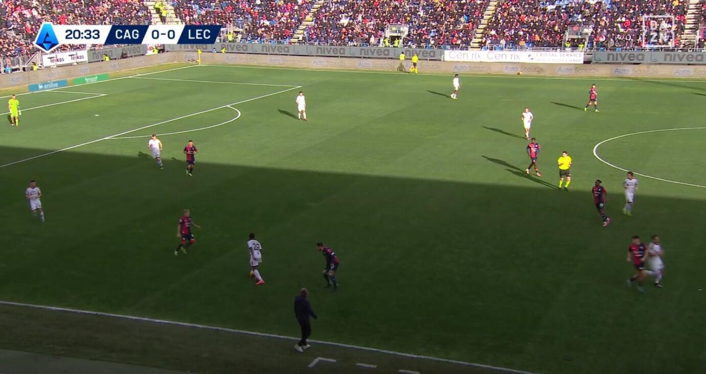 Un’altra differenza rispetto al pareggio contro il Milan è stata la gestione della prima pressione. Se di fronte agli uomini di Sergio Conceicao il Cagliari aveva puntato sull’attesa, così da evitare di essere sorpreso alle spalle dalle verticalizzazioni rapide dei rossoneri, contro il Lecce Nicola ha alzato le linee andando sull’uomo su uomo, pur se non con una particolare aggressività. Piccoli e Viola a coprire i due centrali di difesa, Zortea e Felici i due terzini, mentre Adopo e Makoumbou si alzavano fino alla trequarti per coprire sui due mediani salentini Pierret e Coulibaly.