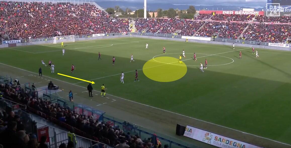 La gestione del pallone partendo dalla difesa ha visto i rossoblù utilizzare l’ormai consolidato sistema del 4+1, con i due terzini a dare opzioni per poi puntare al gioco laterale e Makoumbou a fungere da play e costruttore, con Adopo con compiti da invasore e supporto della manovra offensiva.