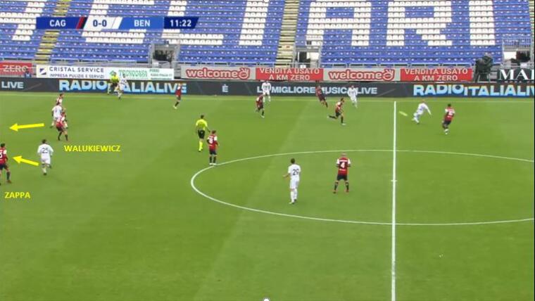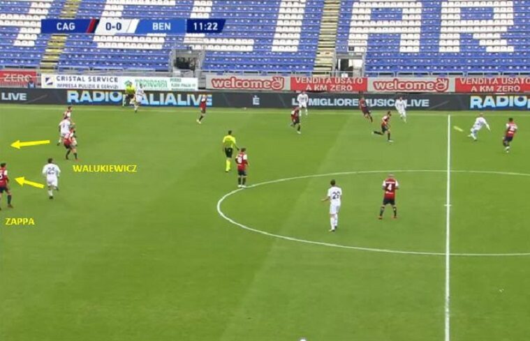 In sede di pagelle chi scrive ha calcato la mano su Walukiewicz più che sul giovane ex Pescara, ma in occasione del pareggio firmato dall’ex Marco Sau il maggiore responsabile sembra essere Zappa e non il centrale polacco. Walukiewicz è impegnato a controllare l’inserimento di Ionita, Ceppitelli segue Lapadula e Zappa resta troppo largo rispetto al compagno. Nello spazio tra esterno e centrale si infila Sau, manca completamente la diagonale da parte di Zappa che potrebbe anche aver peccato in comunicazione, anche se su questo aspetto è impossibile avere una risposta.