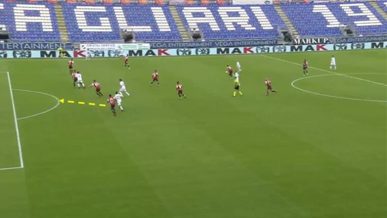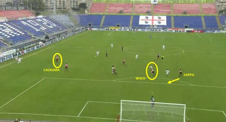 Nella seconda immagine relativa al gol di Sau si apprezza ancora meglio l’errore di Zappa, lo stesso errore commesso anche nelle occasioni precedenti – mancato rigore e palla messa fuori sempre da Sau con un pallonetto – ed errore che ormai si ripete a ogni gara. In questo fotogramma inoltre è evidente il poco filtro dato dal centrocampo. Joao Pedro si sacrifica in copertura, ma viene fatto fuori da un blocco che libera Schiattarella, Nainggolan non è in condizione di aiutare (siamo a fine primo tempo, benzina finita) e Caligara è inspiegabilmente a protezione dell’esterno ben controllato da Tripaldelli. Palla scoperta, situazione di facile lettura soprattutto perché ripetuta più volte dagli avversari, i centrali tardano a scappare all’indietro e Zappa sbaglia completamente la sua posizione già in partenza.