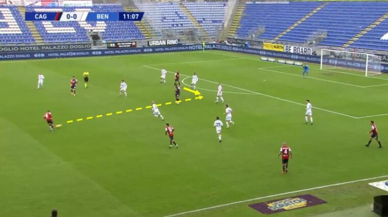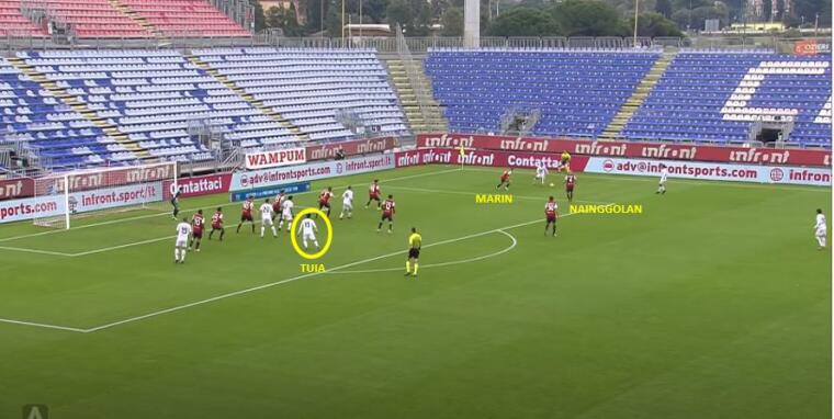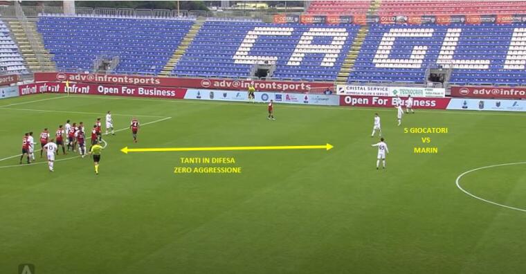 L’esempio lampante è la situazione mostrata in foto. Giro palla – per una volta abbastanza rapido e preciso – al quale fa seguito la verticalizzazione di Marin precisa e con i tempi giusti. Joao Pedro lascia sfilare il pallone con l’idea di avere alle sue spalle Pavoletti come da copione quando in campo c’è Simeone. Al contrario il numero 30 è staccato, non è nella verticale richiesta da Di Francesco che non vuole i due avanti piatti in orizzontale. Le difficoltà offensive non sono certo spiegate solo da questo aspetto, ma anche dettagli di questo tipo danno una chiave di lettura importante.