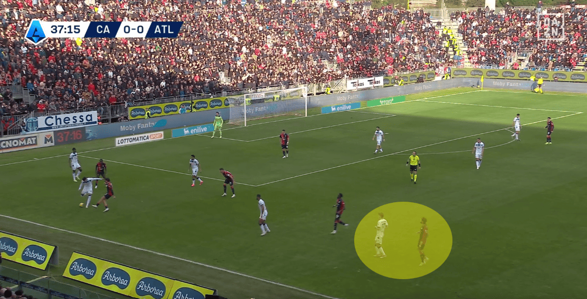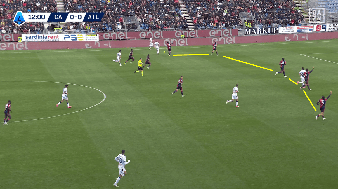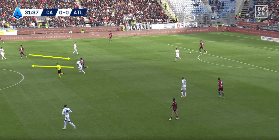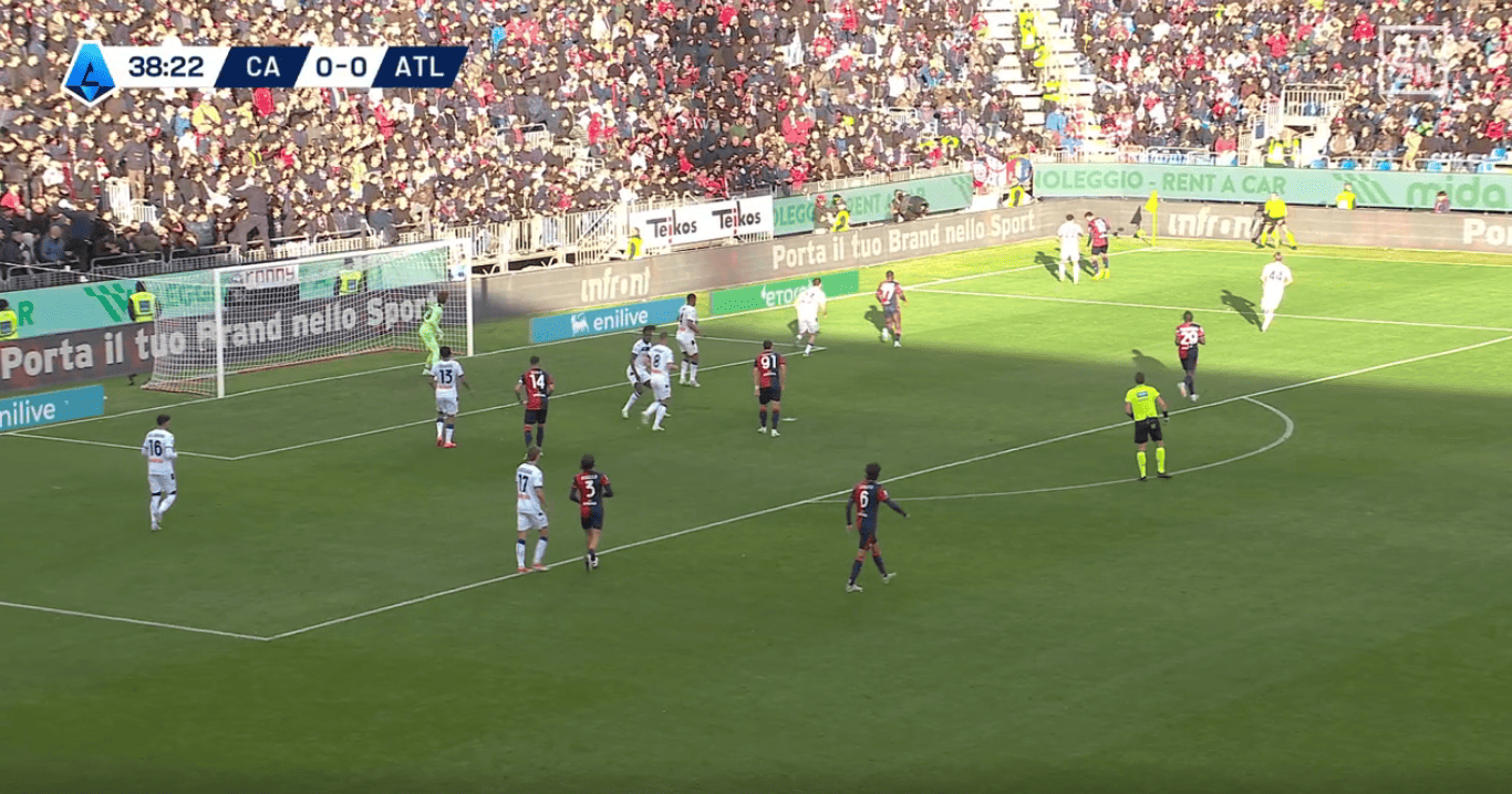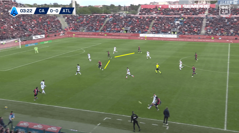 La più grande occasione dei rossoblù per passare in vantaggio è arrivata sul finire del primo tempo, con la tripla parata di Carnesecchi prima sul doppio tentativo di Piccoli poi sul tiro a botta sicura di Zortea. Azione che è nata grazie a una transizione difensiva non volta al rientro sulle proprie posizioni, ma a una riaggressione immediata sulla linea laterale che ha schiacciato l’Atalanta permettendo di guadagnare due rimesse laterali in zona d’attacco. Un cinque contro cinque con pressing totale – e con Piccoli pronto a dare manforte – che non ha permesso ai nerazzurri la costruzione pulita. Non solo in questo caso, perché anche in altre situazioni simili lungo tutti i novanta minuti il Cagliari ha messo in difficoltà una squadra che, normalmente, utilizza la stessa arma.
