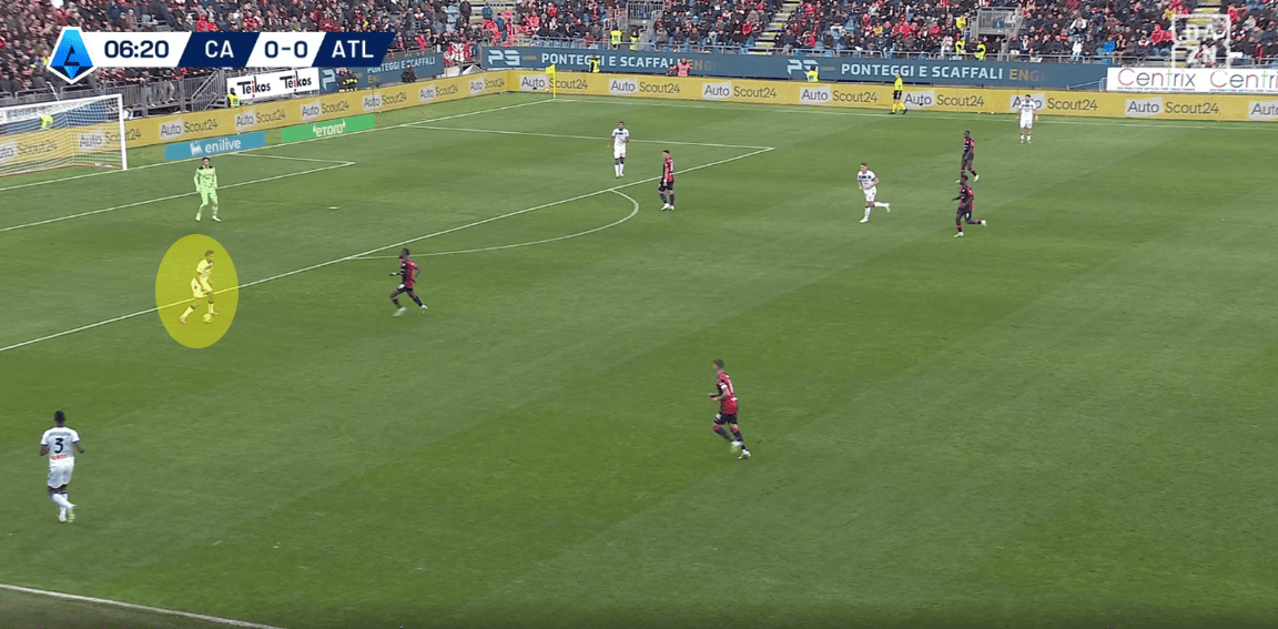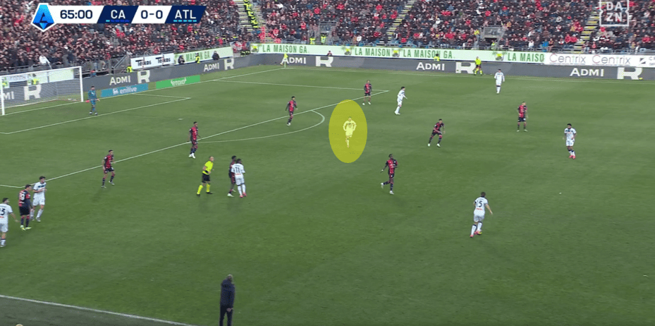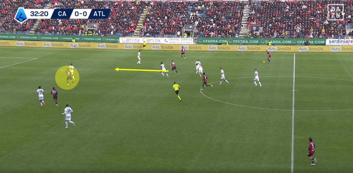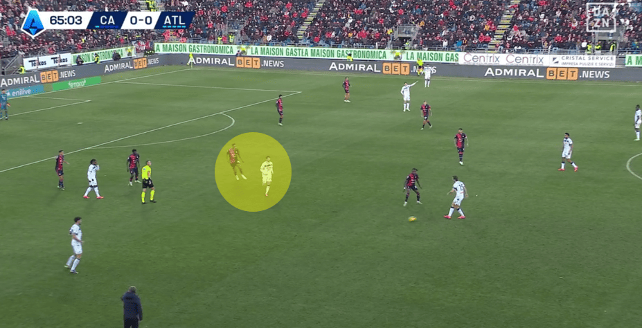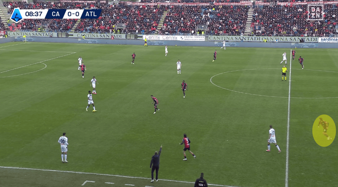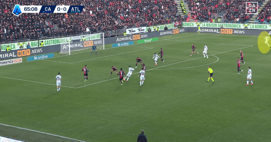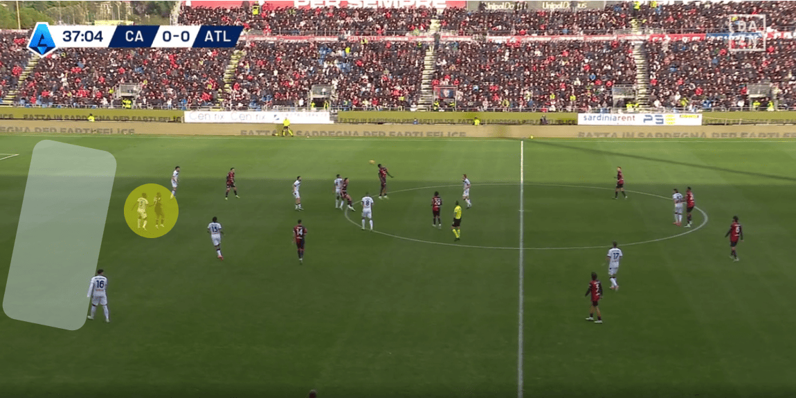 La più grande occasione dei rossoblù per passare in vantaggio è arrivata sul finire del primo tempo, con la tripla parata di Carnesecchi prima sul doppio tentativo di Piccoli poi sul tiro a botta sicura di Zortea. Azione che è nata grazie a una transizione difensiva non volta al rientro sulle proprie posizioni, ma a una riaggressione immediata sulla linea laterale che ha schiacciato l’Atalanta permettendo di guadagnare due rimesse laterali in zona d’attacco. Un cinque contro cinque con pressing totale – e con Piccoli pronto a dare manforte – che non ha permesso ai nerazzurri la costruzione pulita. Non solo in questo caso, perché anche in altre situazioni simili lungo tutti i novanta minuti il Cagliari ha messo in difficoltà una squadra che, normalmente, utilizza la stessa arma.