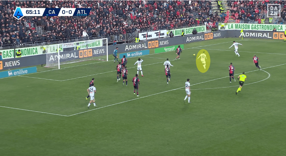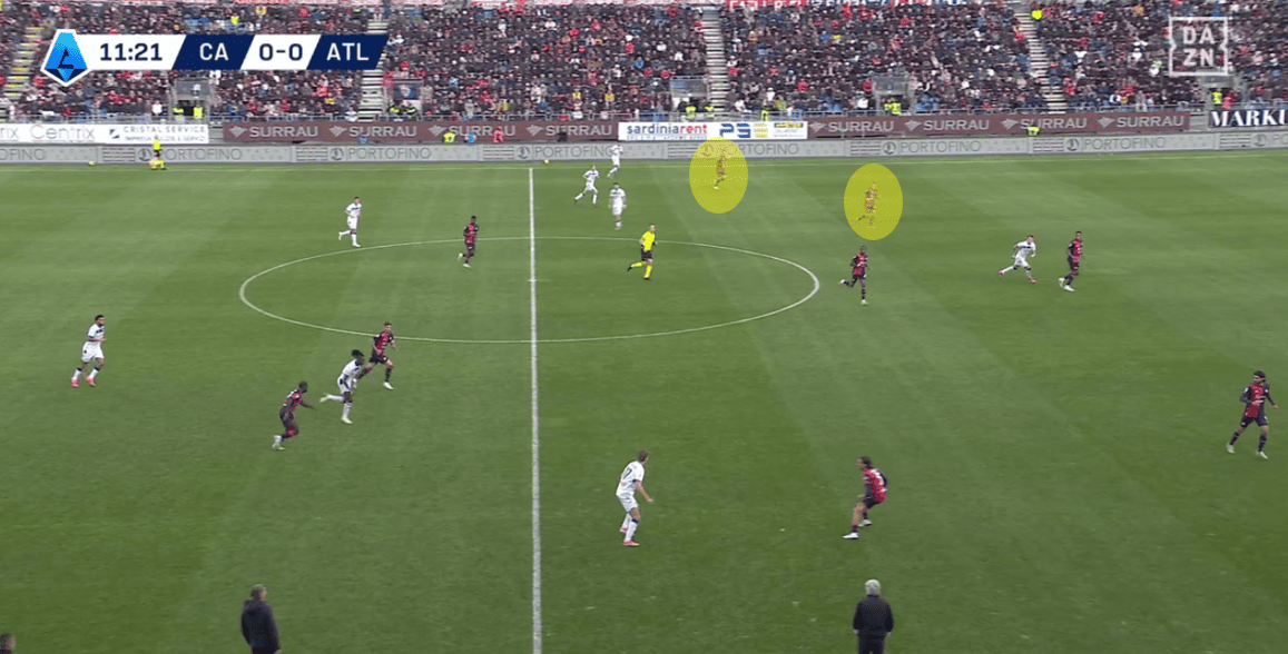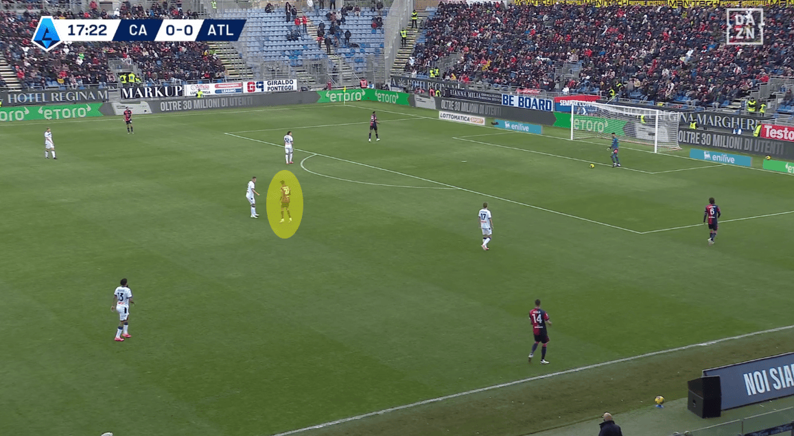L’azione che porta al gol decisivo di Zaniolo parte dalla gestione del pallone da parte dell’Atalanta all’altezza della trequarti offensiva. Il Cagliari è schierato con una linea piuttosto bassa, non uomo su uomo ma più in controllo. A sparigliare le carte è Samardzic che si muove nella zona di rifinitura proponendosi per lo scarico sul centrosinistra da parte di De Roon. Il numero 24 nerazzurro viene “saltato” dal passaggio dell’olandese che allarga su Ruggeri, con quest’ultimo che va a trovare il compagno tra le linee non appena Mina – nel frattempo uscito per rompere la linea e andare in pressione su Samardzic – è costretto a tornare in copertura difensiva.