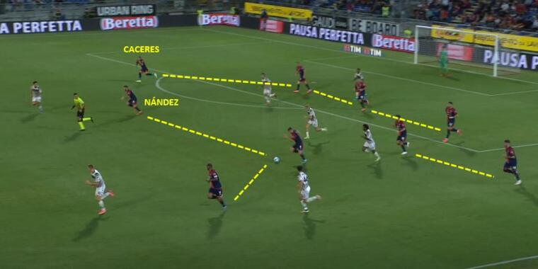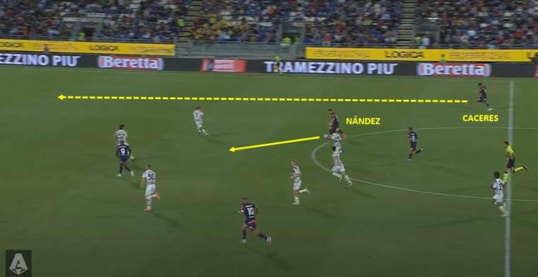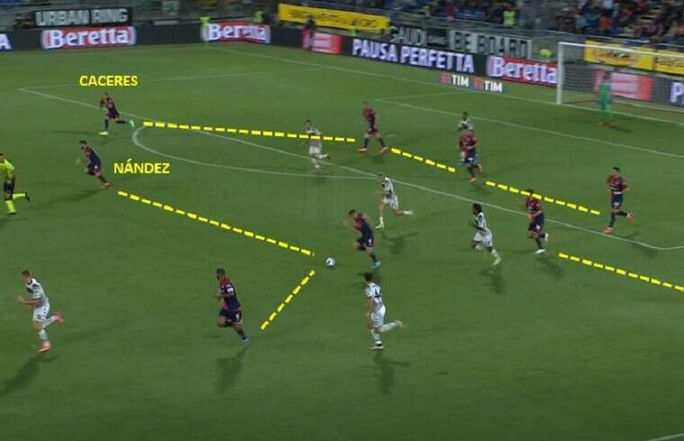 Il gol del momentaneo vantaggio siglato da Keita è uno degli aspetti positivi dei rossoblù di Mazzarri visti nella gara contro il Venezia. Non tanto per la rete in sé, quanto per come è stata costruita. Una transizione partita dal limite sinistro della propria area e conclusa nell’area opposta con il colpo di testa del senegalese. Quando Marin recupera palla su Busio si può notare la posizione di partenza di Nández e Caceres, oltre la disposizione con il 4-2-3-1 della squadra anche quando spostata sulla sinistra.