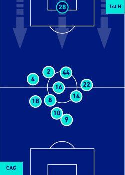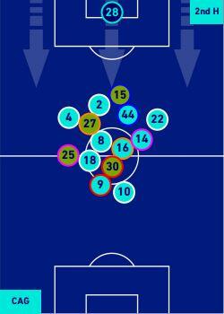 Il vero nodo è però rappresentato dal baricentro dei rossoblù di Mazzarri, logica conseguenza della fin troppa voglia di portare a casa il risultato e del cambio di posizione in campo di Marin. Se con l’ingresso di Altare nel finale si è tornati al 5-3-2, è comunque da sottolineare come la squadra abbia arretrato sensibilmente le proprie linee rispetto alla prima frazione. Nel primo tempo il Cagliari ha avuto un baricentro difensivo medio a quasi 57 metri dalla porta di Cragno, nella ripresa a poco più di 47 metri, quasi dieci metri più basso. Anche la compattezza è andata perdendosi, con una squadra che nei primi 45 minuti era raccolta in 27 metri in fase difensiva, mentre nella ripresa in quasi 31 metri.