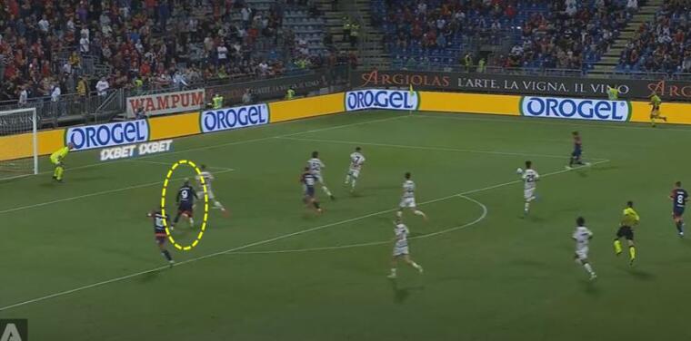 Tornando all’importanza di Marin e dei suoi strappi verticali, anche in occasione del palo colpito dall’ex Ajax si vede la sua capacità di conduzione della palla centralmente affondando tra le linee avversarie. Sfera ricevuta sulla linea mediana e poi palla al piede fino al limite dell’area del Venezia, approfittando anche dei movimenti a supporto di Nández, Keita, Joao Pedro e soprattutto Deiola che a sinistra allarga la difesa dei lagunari.
