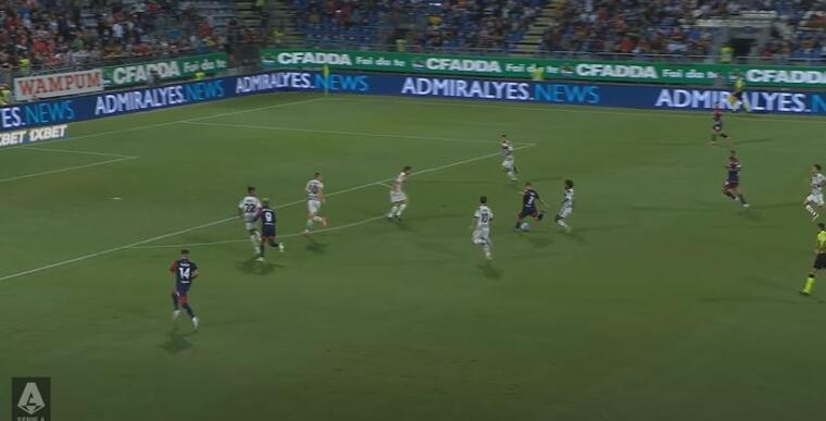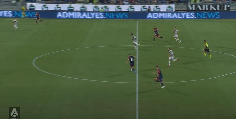 La chiusura dell’azione permette di apprezzare come siano proprio i tre subentrati del Cagliari a mancare maggiormente nel momento topico. Zappa non ha recuperato nessun centimetro su Busio, Grassi è a distanza siderale da Heymans e non aiuta provando a chiudere perlomeno altri tipi di giocata, infine Altare ha la possibilità di rimediare intervenendo sull’assist orizzontale, ma anche in questo caso appare macchinoso e inspiegabilmente poco deciso nell’intervento quando, probabilmente, sarebbe bastata una scivolata per spedire in angolo la sfera.