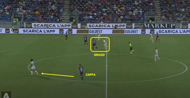 La palla viene servita in verticale in direzione di Forte e Heymans asseconda l’azione dettando la triangolazione lunga. Zappa è ancora lontano da Busio – l’americano ha 91 minuti nelle gambe, il rossoblù appena 20 – mentre Grassi ha perso completamente l’attimo per fermare Heymans. In questo frangente entra in gioco Altare che è fin troppo lontano da Forte.