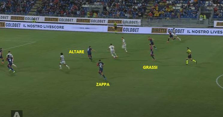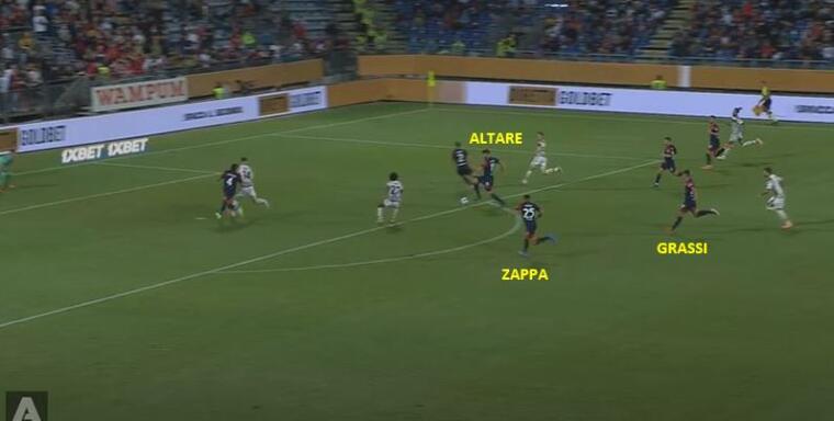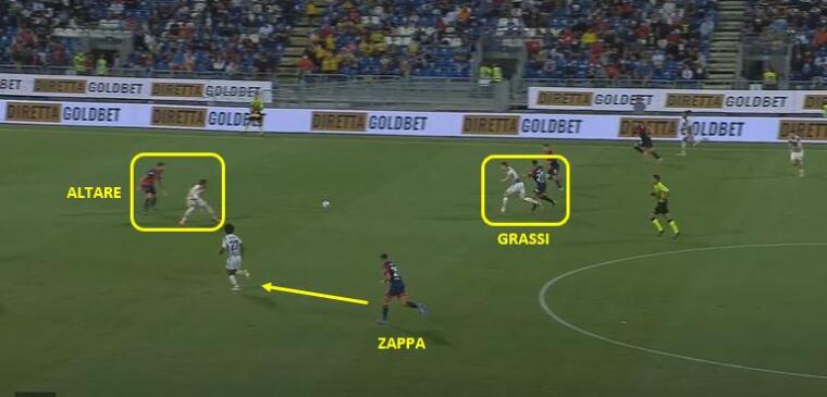 L’ex centrale dell’Olbia resta a una distanza troppo ampia dalla punta avversaria, permettendogli così di girarsi e chiudere il triangolo con Heymans. Con così tanta distanza Altare potrebbe compensare chiudendo la linea di passaggio o provando a tagliare verso l’inserimento dell’avversario lasciato partire da Grassi. Il difensore rossoblù è però troppo macchinoso, resta sulle gambe e non riesce né a contrastare Forte né a limitare Heymans.