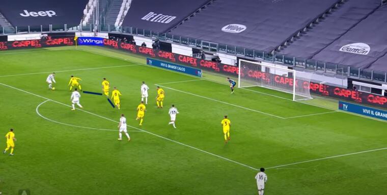 Quando la Juventus attaccava la linea rossoblù passava a cinque con l’abbassamento da un lato di Zappa e dall’altro di Tripaldelli. Il problema però nasceva nel momento in cui uno dei due attaccanti puri bianconeri, Ronaldo o Morata, uscivano dalla linea difensiva per portarsi sulla trequarti. La scelta di Di Francesco ĆØ stata quella di far salire uno dei centrali, spesso uno tra Pisacane e Klavan, lasciando cosƬ lo spazio agli inserimenti degli esterni bianconeri e costringendo cosƬ quelli difensivi rossoblù a movimenti a fisarmonica, dalla fascia al centro e viceversa. Da notare anche la posizione di Joao Pedro e Ounas che portavano la squadra a disporsi con una sorta di 541 o, più spesso, 5221.