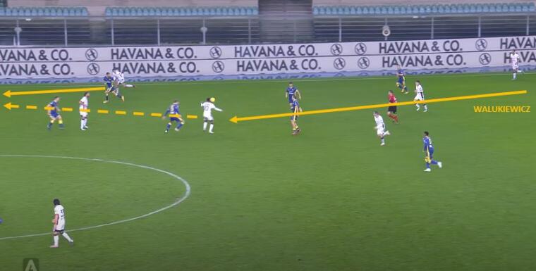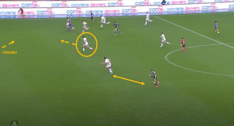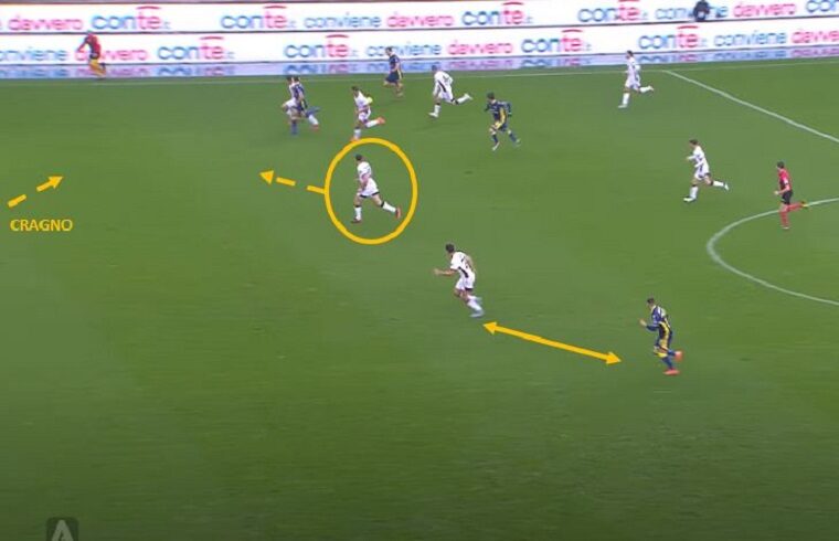 L’esempio è in una delle tante proiezioni sulla destra d’attacco da parte del Cagliari nella ripresa. Walukiewicz, ancora lui, gioca il pallone in verticale tra le linee, trova Joao Pedro che a memoria serve sul lungo Zappa che nel frattempo aveva lasciato partire la propria corsa. Importante anche la posizione di Pavoletti che, per tutta la gara, ha creato spazi alle proprie spalle lottando continuamente con la difesa scaligera.