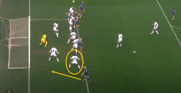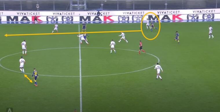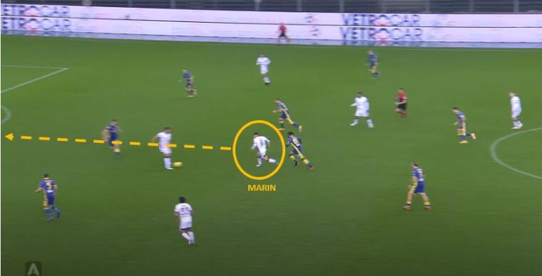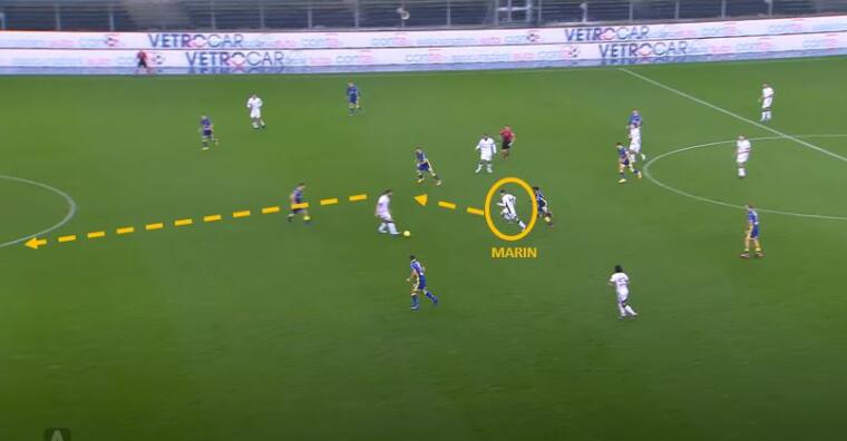 La rete del classe ’96 romeno arriva con una giocata che ricorda quelle delle mezzali inglesi box to box. Un gol alla Gerrard o alla Lampard, con Marin che si inserisce tra le linee, resiste alle diverse cariche e batte il portiere in uscita. Non quindi un muovere la palla tra le linee, ma un muovere se stessi alla ricerca del triangolo lungo con Walukiewicz e Pavoletti.