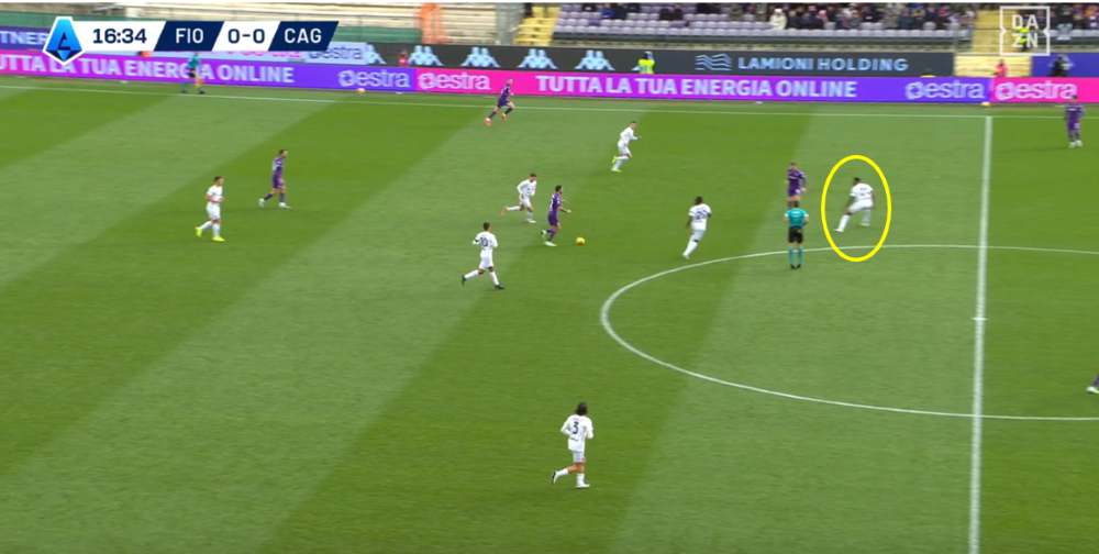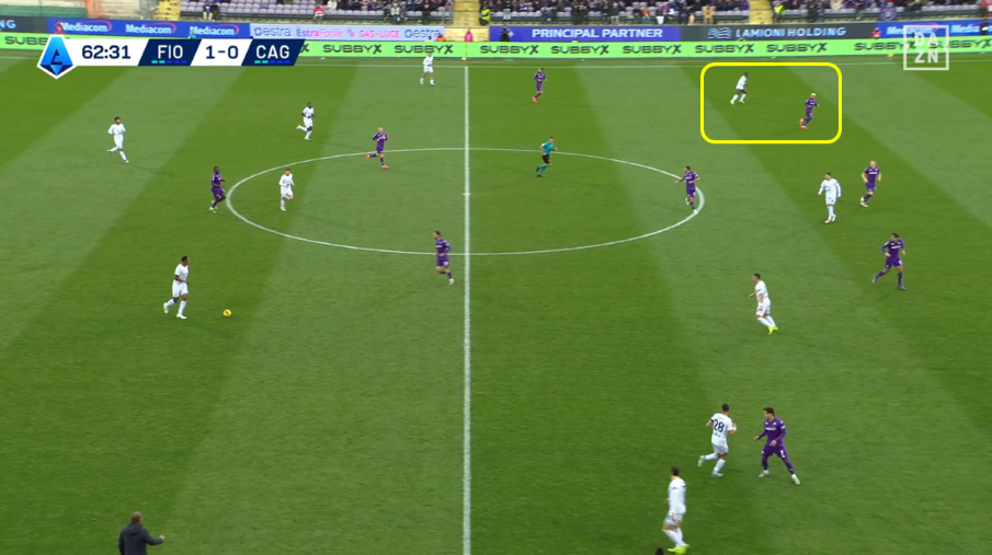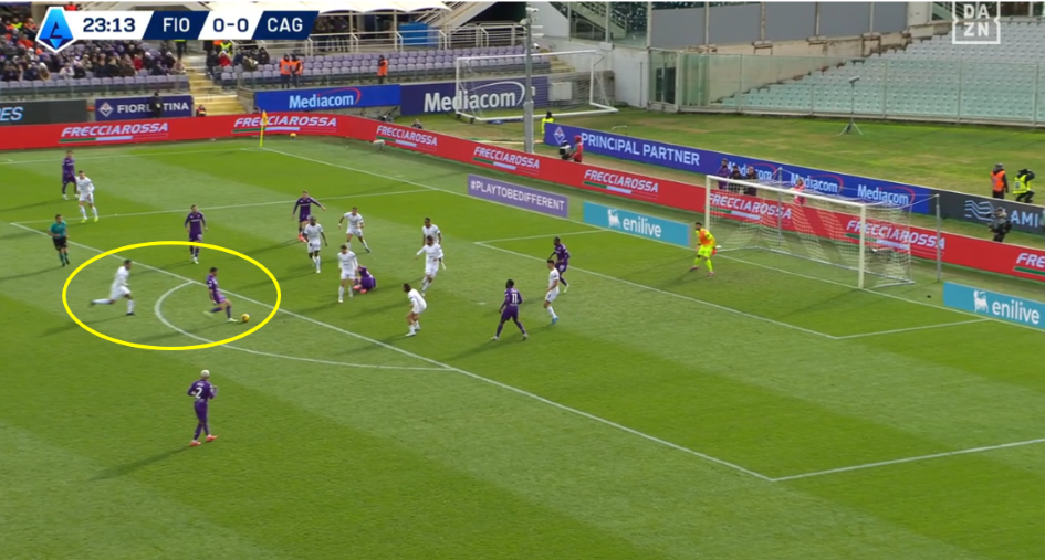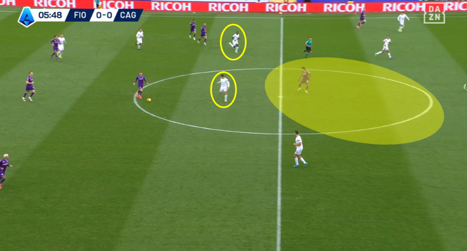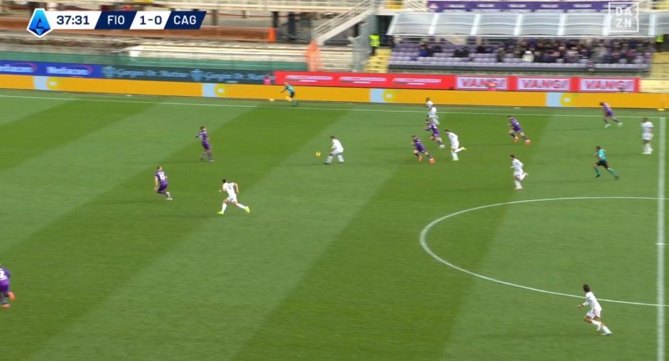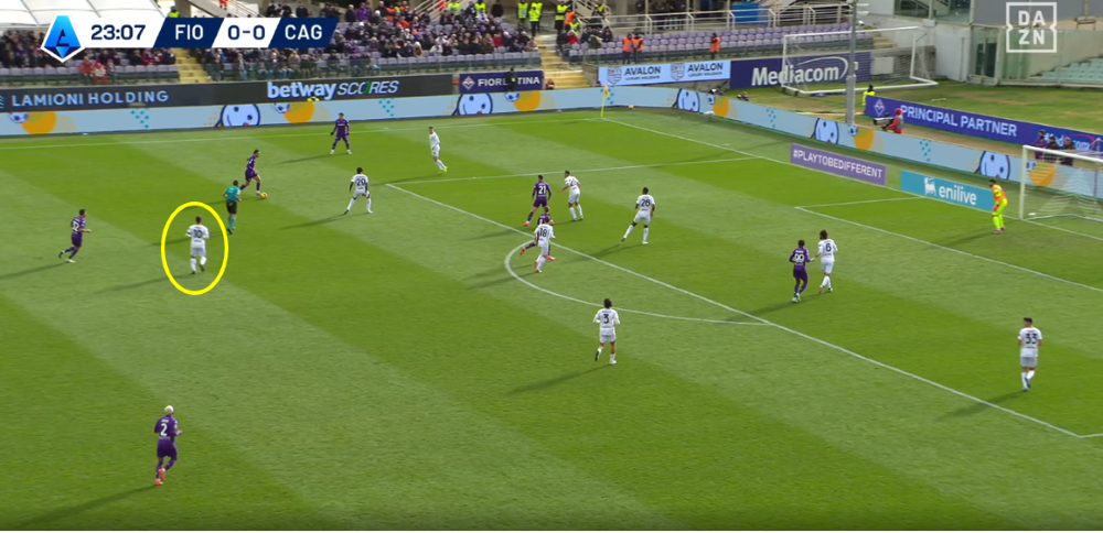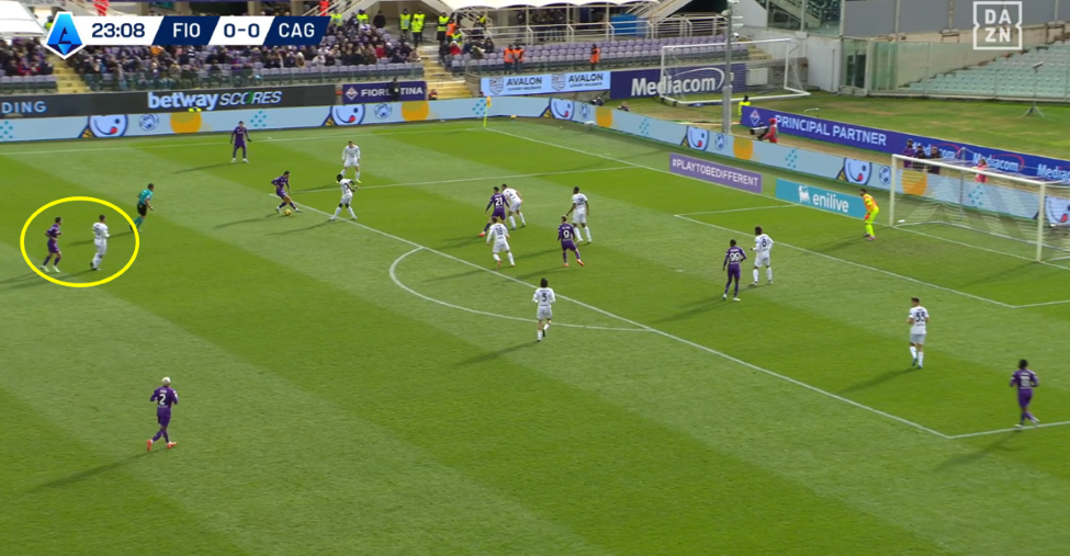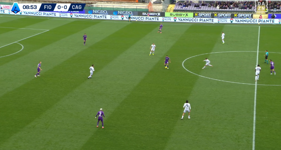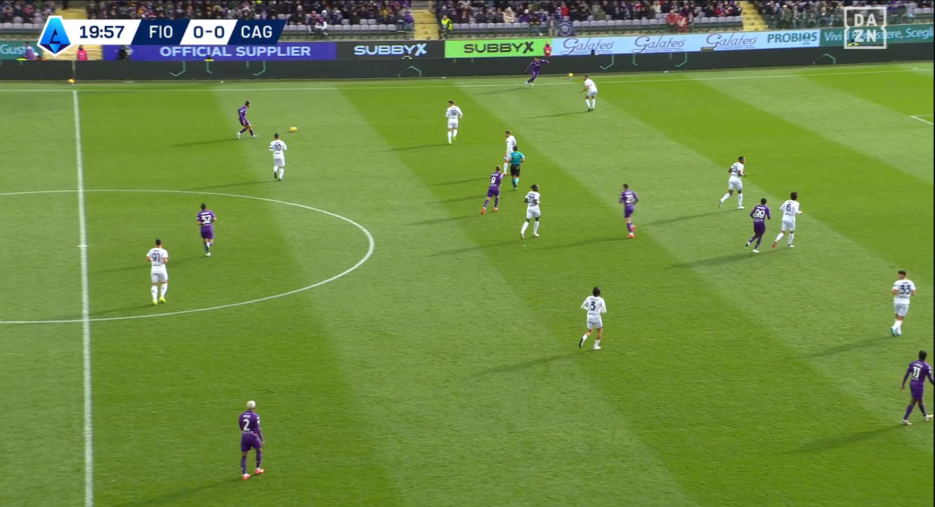 Il tentativo del Cagliari nelle due fasi di transizione è stato quello di una riaggressione immediata non appena persa palla, ma senza troppa foga, e di un attacco alla profondità cercando il supporto di Viola tra le linee non appena riconquistata. Tentativo riuscito a metà , perché pur se in diverse situazioni gli uomini di Nicola hanno creato i presupposti per trovare scoperta la difesa della Fiorentina, allo stesso tempo gli errori tecnici e di scelte hanno limitato la trasformazione del potenziale in reale. A volte Marin, altre Makoumbou, altre ancora Piccoli e più spesso di tutti Viola non sono riusciti a dare quella velocità di esecuzione e quella tranquillità nelle scelte di gioco utili per creare pericoli, con diverse occasioni sprecate sul nascere come quella mostrata, quando il numero 10 ha sbagliato sia il modo che il tempo del passaggio.