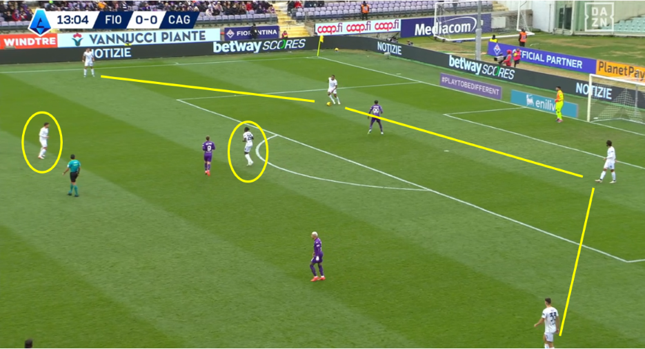 La conseguenza è stata la libertà di Beltran che da numero 10 vero e proprio è stato capace di trovare un’ampia zona di campo da riempire con i suoi movimenti a uscire, un vero e proprio regista offensivo che ha creato non pochi problemi al Cagliari. Le due opzioni in mano ai rossoblù erano o quella di lasciare un centrale di difesa libero da pressione – con quindi Viola e Piccoli che alternativamente scalavano su uno dei mediani e Makoumbou-Marin a fare lo stesso su Beltran – oppure quella di chiedere a uno dei propri centrali di rompere la linea a quattro e salire uomo su uomo sul numero nove argentino, lasciando però scoperta la zona difensiva.