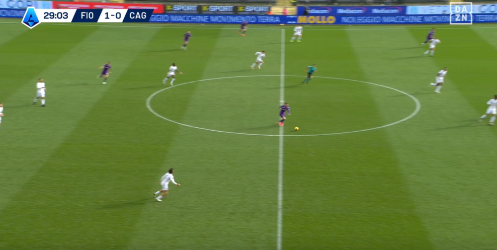 La richiesta di Palladino a metà della prima frazione è stata chiara. Gestire il pallone a costo di tornare verso De Gea per chiamare a sé la pressione del Cagliari e liberare, appunto, lo spazio centrale per Beltran attraverso un giro palla rapido. La Fiorentina è riuscita così a creare zone di rifinitura da attaccare in verticale grazie alla qualità in impostazione di Ranieri, oltre a far muovere i due mediani rossoblù che hanno via via perso compattezza e distanze.
