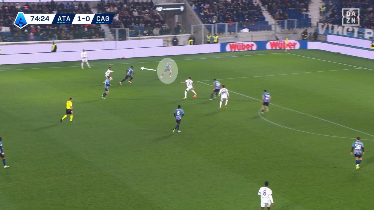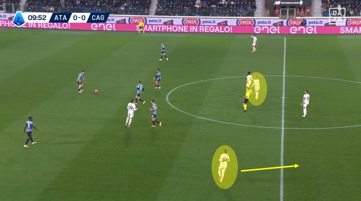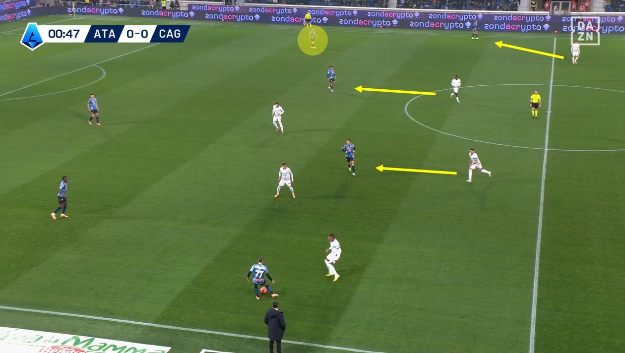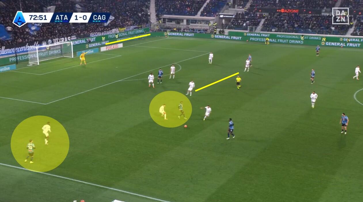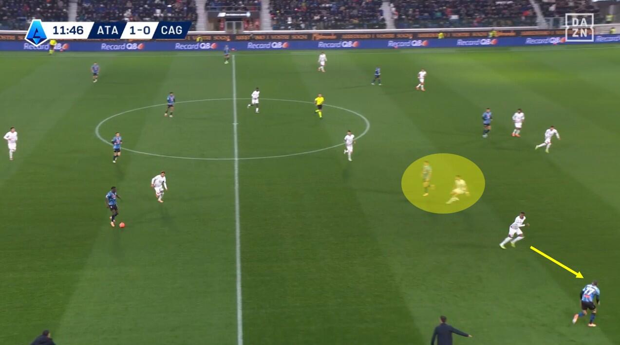 Il problema principale del Cagliari è stato però quando l’Atalanta, attraverso il giro palla, ha portato il possesso sul lato opposto. Con Palestra su Bernasconi e Zappa a uomo su Lookman – e pronto a rompere costantemente la linea andando fino alla metà campo avversaria – ecco che Adopo e Borrelli non sono riusciti a gestire nel migliore dei modi il trio formato da Kolasinac, Ederson e Djimsiti. Soprattutto i primi due sono riusciti ad alternarsi nel liberarsi dal controllo, con Ederson spesso e volentieri capace di impostare con tempo e spazio e Kolasinac pronto ad accompagnare la fase offensiva andando in verticale con o senza palla.