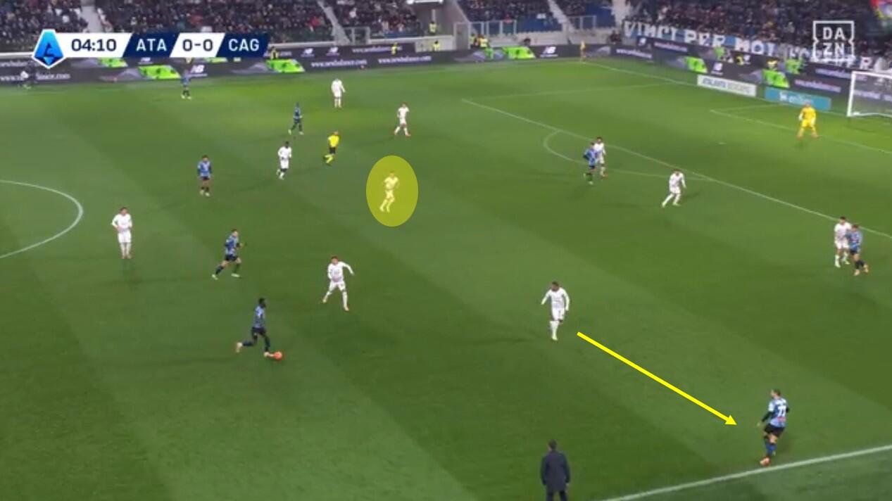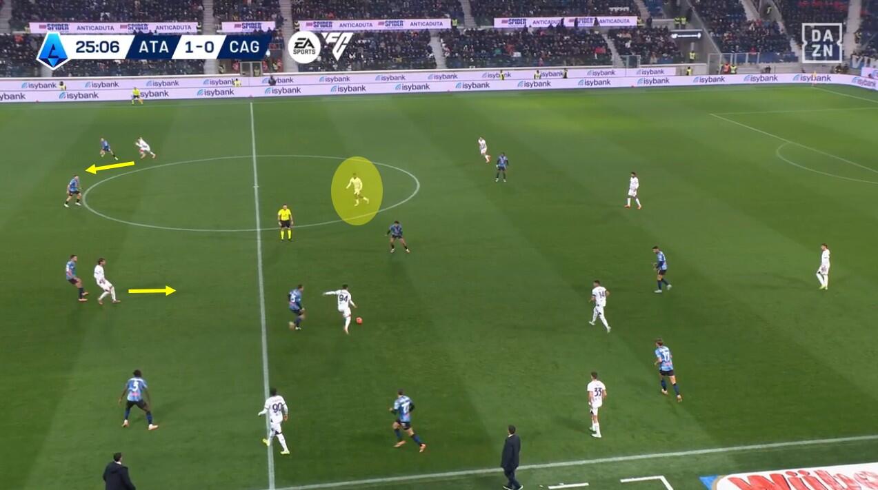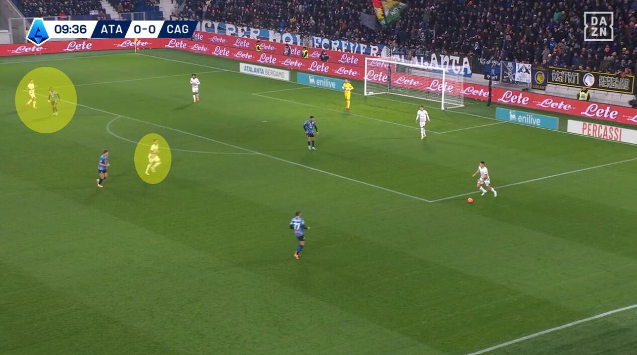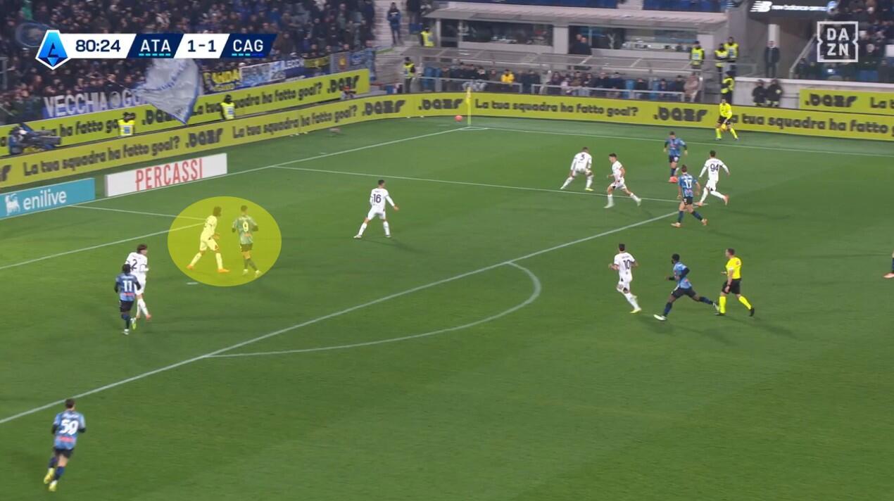 Il problema principale del Cagliari è stato però quando l’Atalanta, attraverso il giro palla, ha portato il possesso sul lato opposto. Con Palestra su Bernasconi e Zappa a uomo su Lookman – e pronto a rompere costantemente la linea andando fino alla metà campo avversaria – ecco che Adopo e Borrelli non sono riusciti a gestire nel migliore dei modi il trio formato da Kolasinac, Ederson e Djimsiti. Soprattutto i primi due sono riusciti ad alternarsi nel liberarsi dal controllo, con Ederson spesso e volentieri capace di impostare con tempo e spazio e Kolasinac pronto ad accompagnare la fase offensiva andando in verticale con o senza palla.