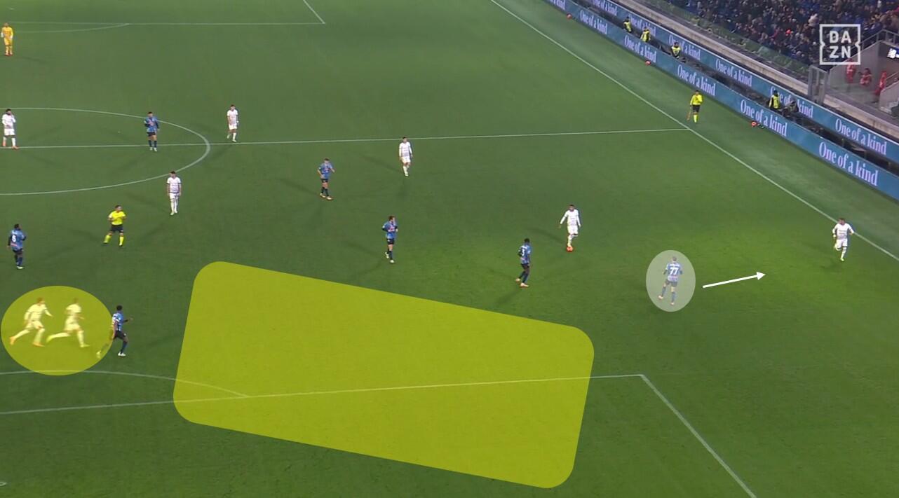La costruzione con il classico 4+1 ha avuto in Deiola il riferimento centrale, mentre è da notare come Zappa, con il pallone giocato sul lato opposto, si è avvicinato a Lookman in una marcatura preventiva prevista e ben eseguita.