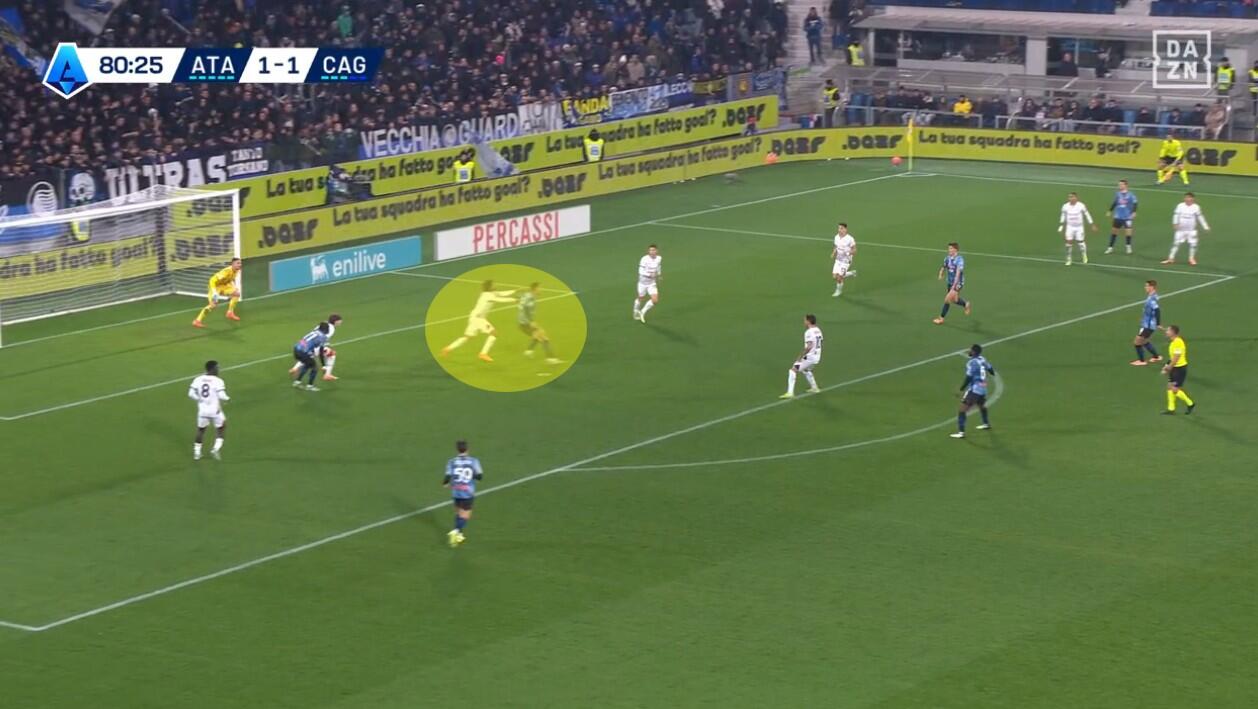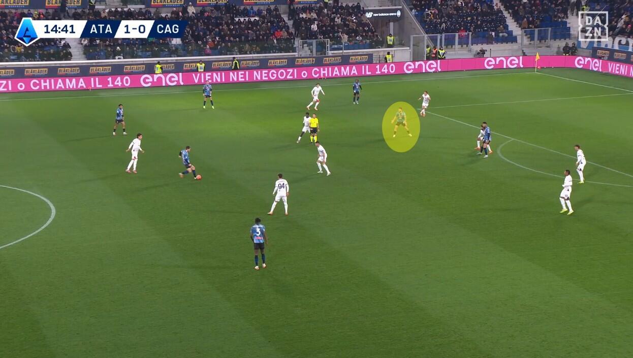 Con l’Atalanta che ha puntato sulle transizioni rapide, l’aspetto più importante a livello difensivo per il Cagliari sono stati quelli dell’attenzione e delle marcature preventive. Se nel secondo caso l’atteggiamento è stato positivo e lineare, nel primo i dettagli hanno fatto la differenza. Tanto che il gol del primo vantaggio dell’Atalanta è arrivato per via di una minima disattenzione che, nel gioco di transizioni, può fare la differenza. Folorunsho, infatti, reclama un fallo ai propri danni di De Roon, perdendo per pochi secondi il contatto mentale con la fase difensiva e lasciando così scoperta la zona occupata da Zappacosta.