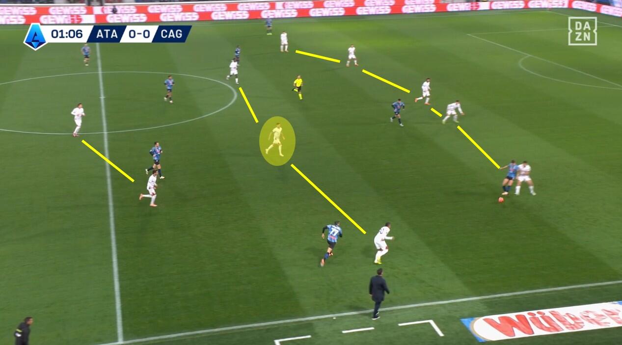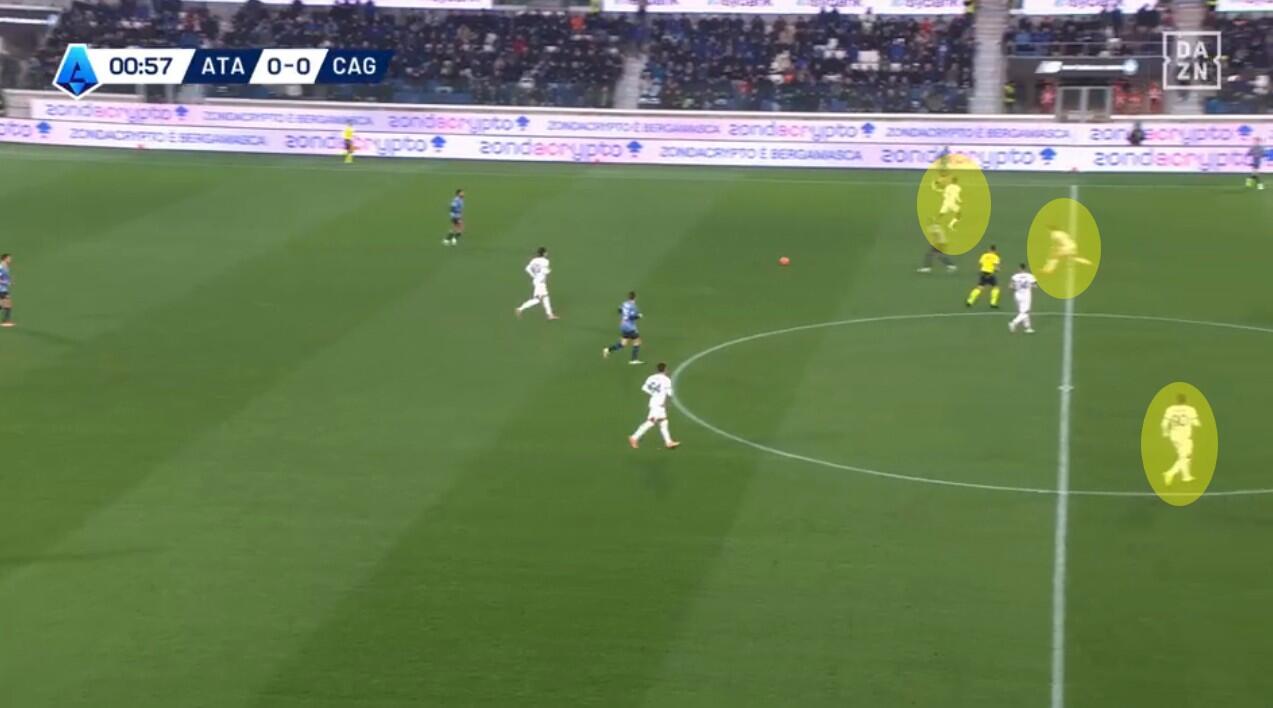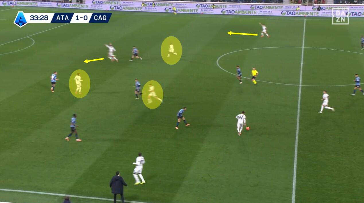 Con l’Atalanta che ha tenuto maggiormente il pallino del gioco, il Cagliari in non possesso ha messo in campo lo stesso 5-3-2 visto contro la Roma. A fare da equilibratore davanti alla difesa è stato nuovamente Deiola, con il compito di controllare la zona di rifinitura nerazzurra e aiutare all’occorrenza o la fascia sinistra difensiva – occupata da Obert su De Ketelaere e da Folorunsho su Zappacosta – o quella destra, con Palestra su Bernasconi e Adopo su Ederson o Kolasinac.