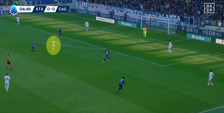 La costruzione ha visto il classico 4+1 come accaduto durante quasi tutto l’arco del campionato, con dunque in fase di possesso lo schieramento che passava dal 5-4/1 al 4-1/4-1 grazie all’avanzamento di Zortea e al conseguente scivolamento di Zappa come terzino destro, all’accentramento di Adopo che con Deiola diventavano mezzali di fianco a Makoumbou e, infine, ad Augello che da quinto diventava quarto di difesa a sinistra con Felici davanti a lui. I quattro difensori davano opzioni di giocata a Caprile, Makoumbou era l’unico costruttore nel ruolo di play centrale, Deiola e Adopo come incursori – seppur abbastanza bloccati – e le due varianti sull’esterno a fungere da soluzioni per uscire dalla pressione dell’Atalanta.