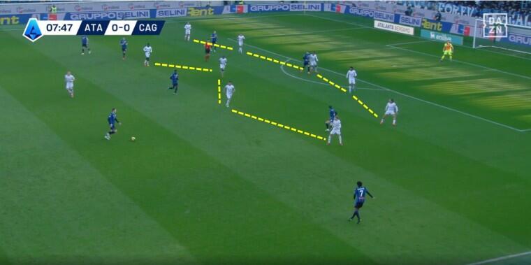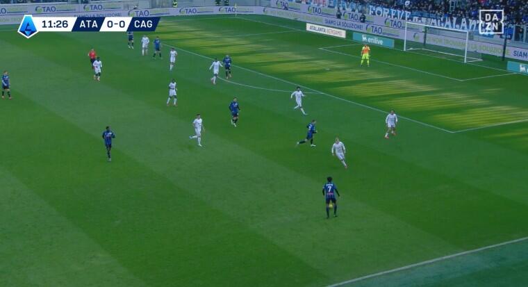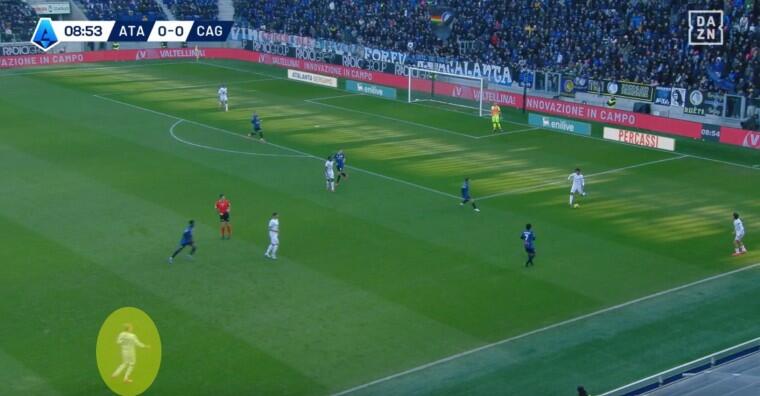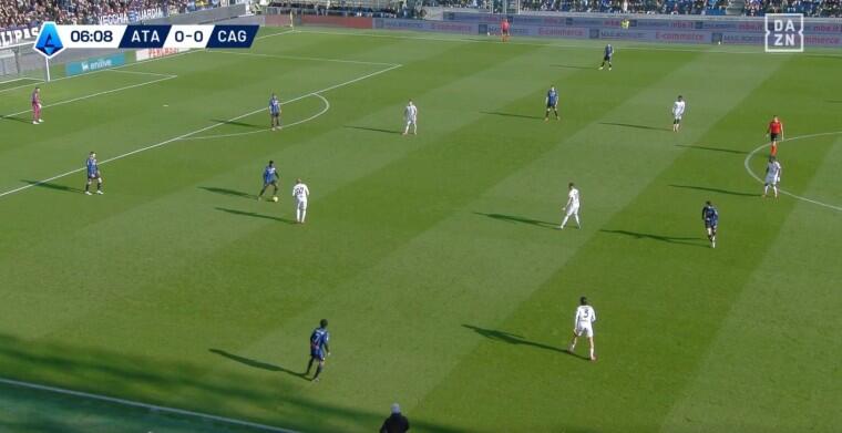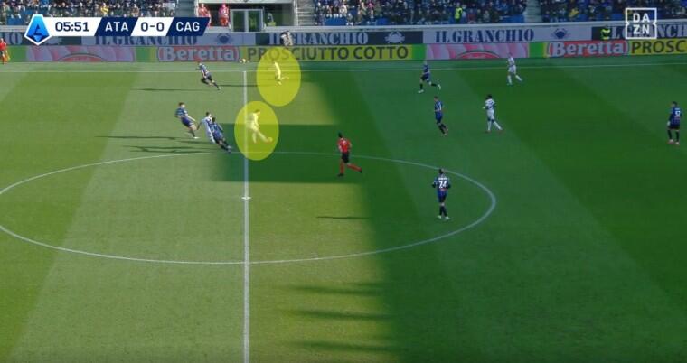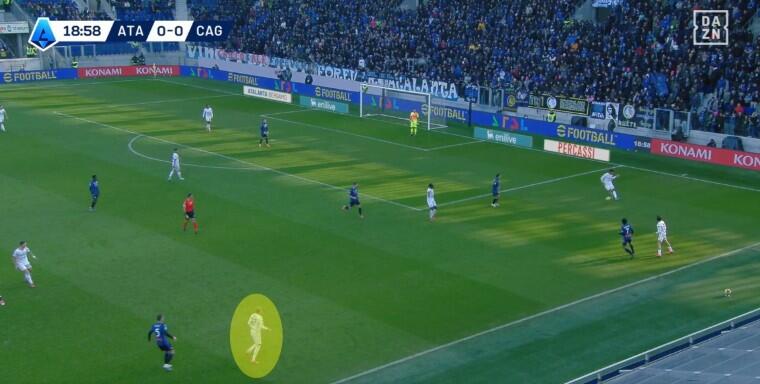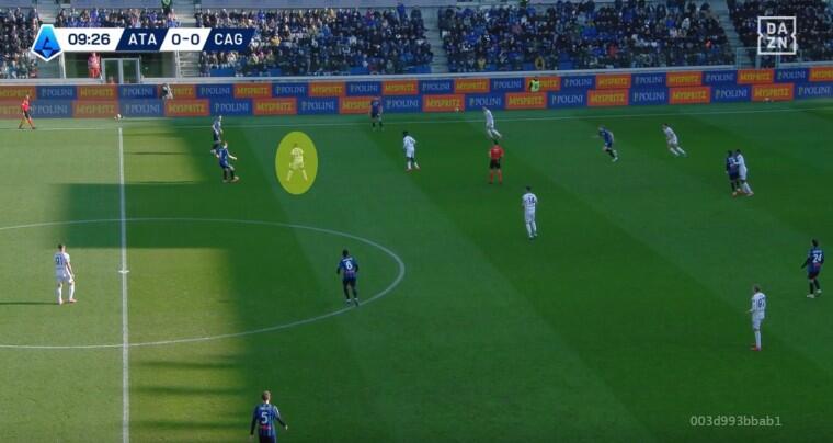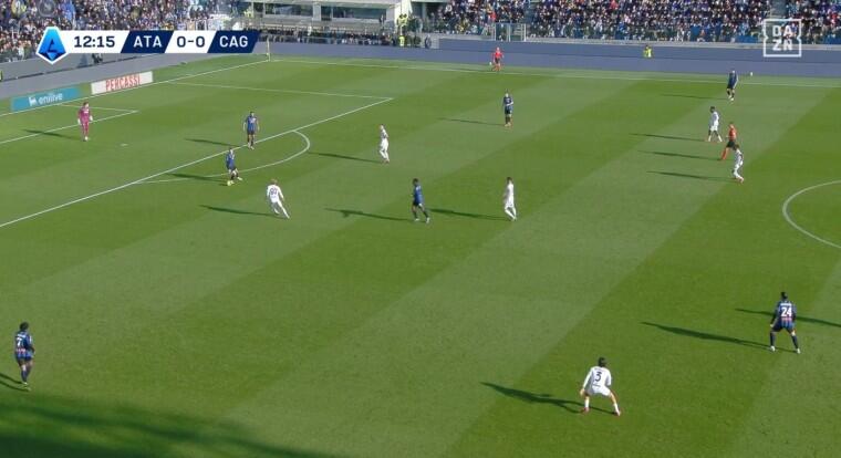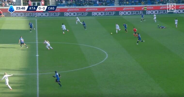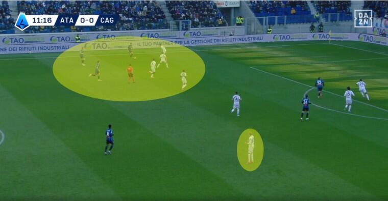 La prima situazione di rilievo è stata lo schieramento quando l’Atalanta si proponeva in fase offensiva. Il Cagliari in queste occasioni passava a un 5-4/1 con Piccoli come unico giocatore escluso dallo scivolamento sotto la linea del pallone, mentre Adopo si spostava in una posizione di esterno destro di centrocampo, con Deiola e Makoumbou come centrali e Felici come esterno sinistro. La difesa a cinque vedeva Zortea e Augello come laterali, Zappa e Luperto nel ruolo di braccetti e Mina a seguire il riferimento avanzato dell’Atalanta, ossia il capocannoniere Retegui. Squadra corta, mezzi spazi occupati, zona di rifinitura senza sbocchi per i nerazzurri di Gasperini.