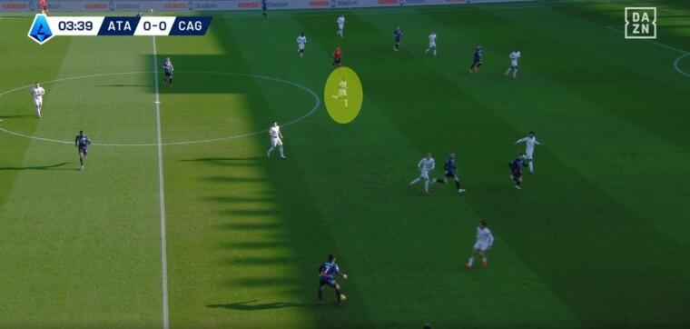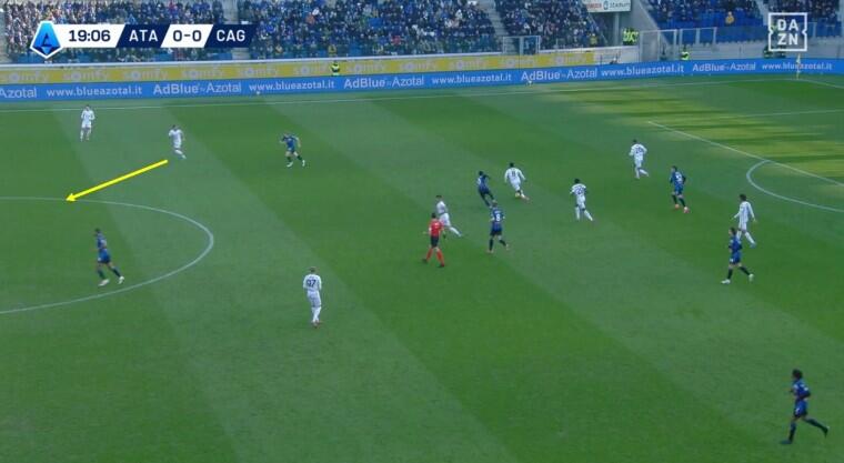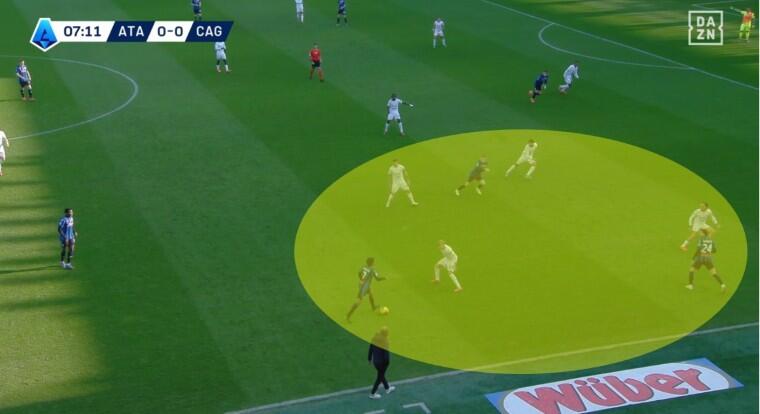 Un Cagliari che non ha completamente rinunciato agli uno contro uno, ma che comunque ha esercitato una prima pressione non aggressiva, seppur non limitandosi all’attesa. Quando l’Atalanta provava a costruire dal basso i rossoblù andavano a controllare i singoli nerazzurri, provando a restare compatti e allo stesso tempo a spegnere la velocità nelle triangolazioni degli uomini di Gasperini. Consapevole che i nerazzurri difficilmente sarebbero andati – per caratteristiche dei giocatori in campo – al lancio lungo e ai palloni tra le linee, il Cagliari è riuscito a limitare gli avversari senza rincorrerli, ma aspettandoli a tratti alti a tratti più bassi a seconda delle necessità .
