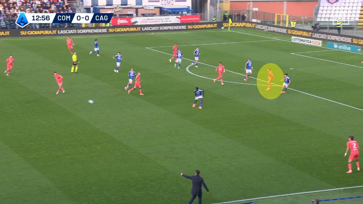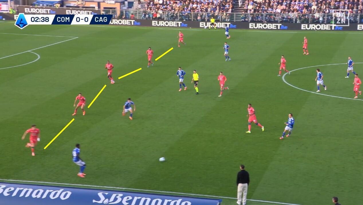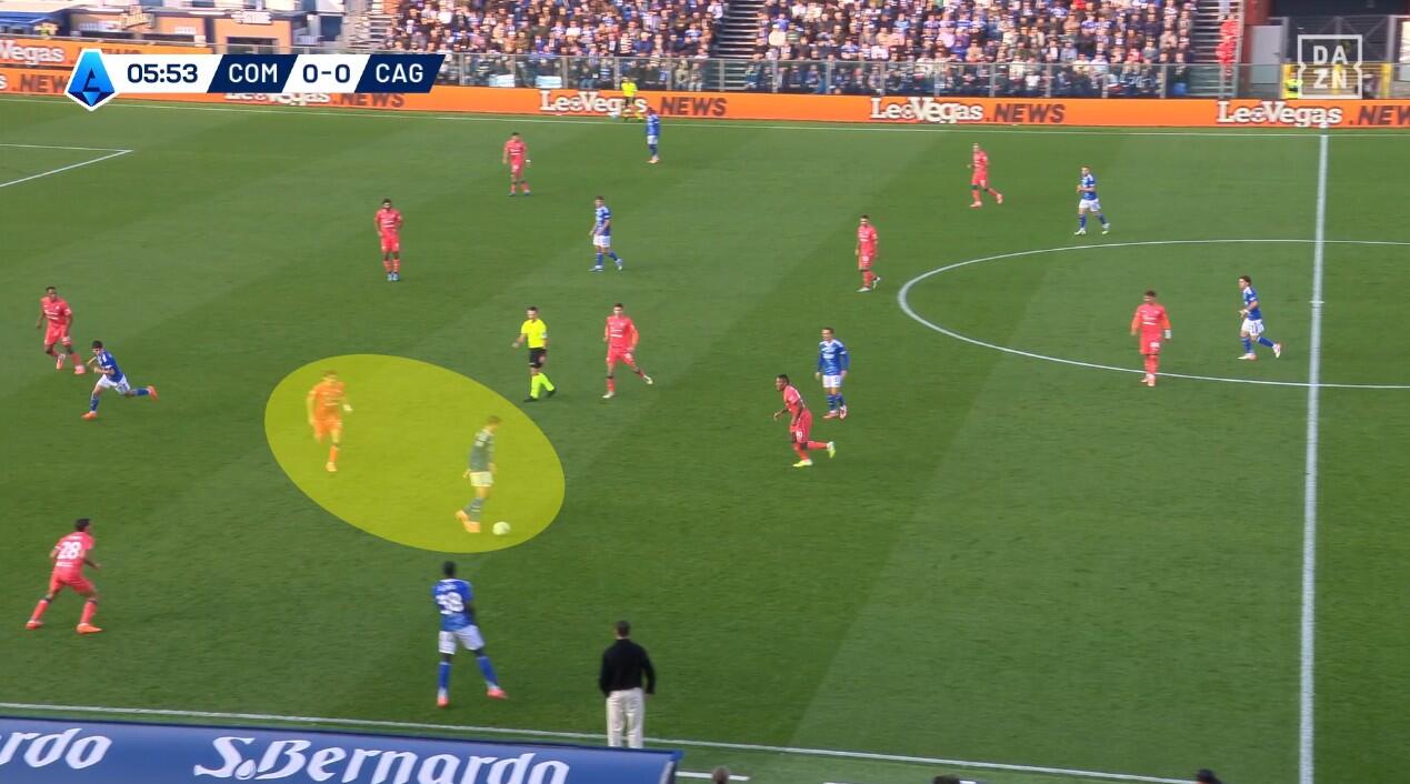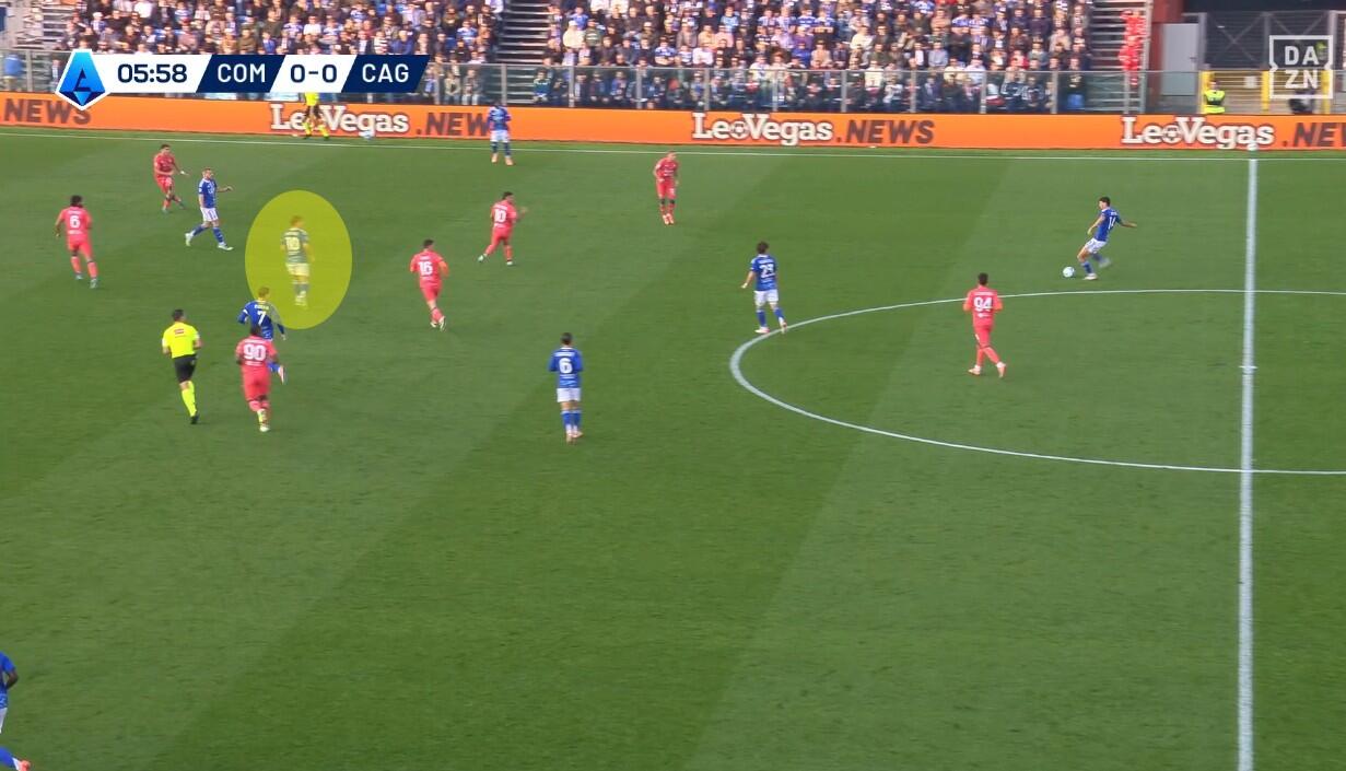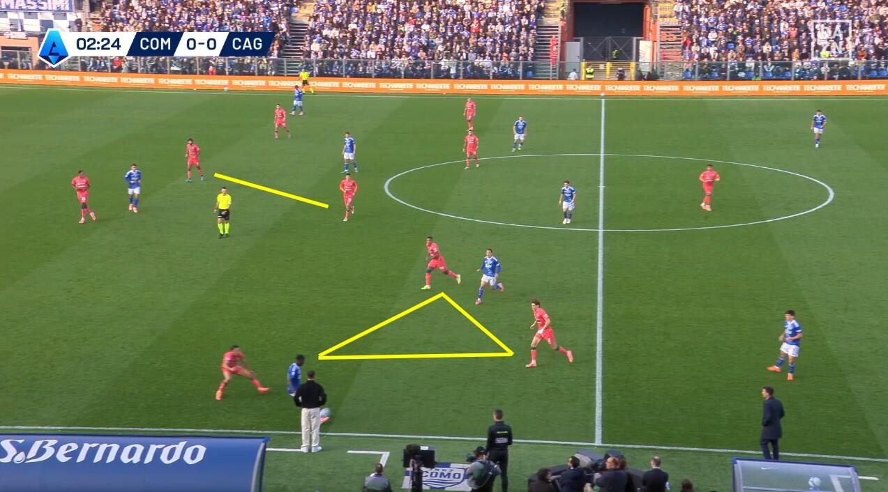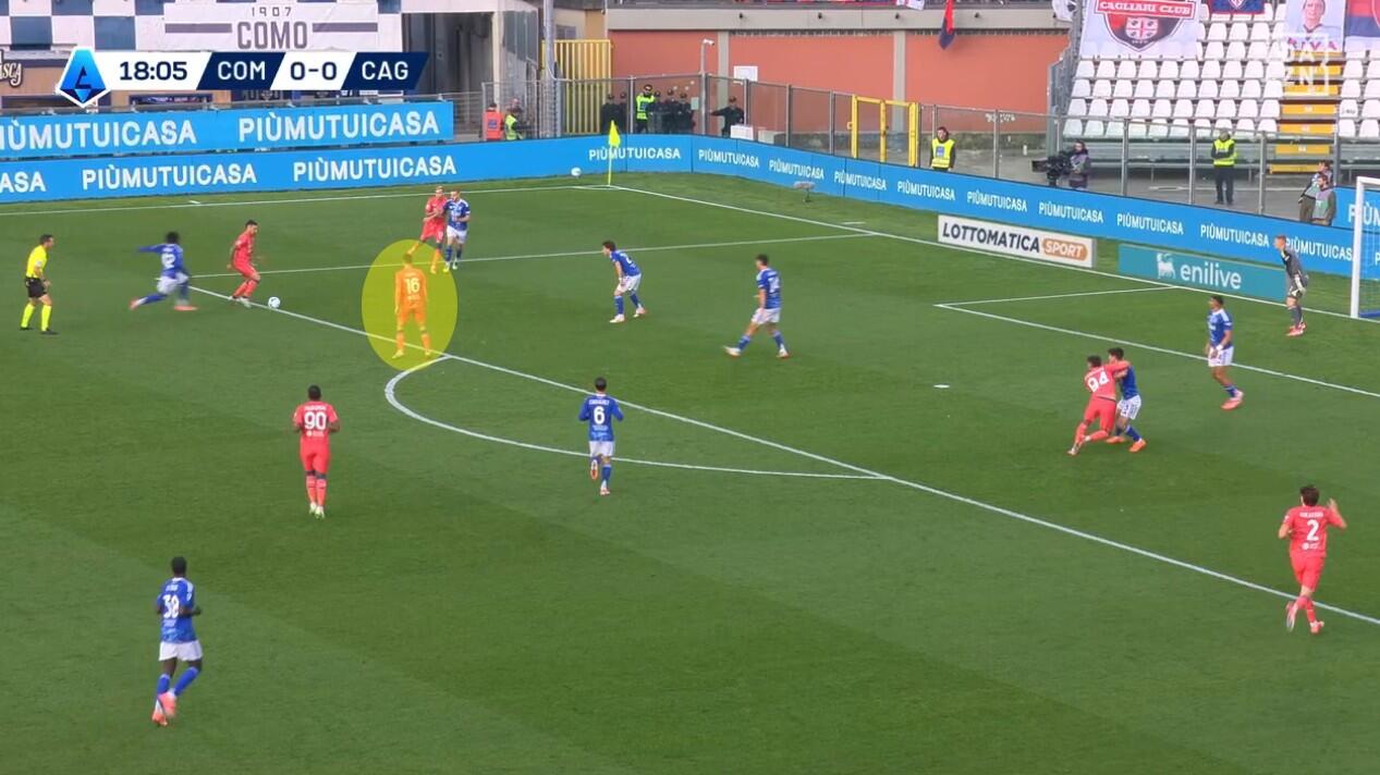 Lo schieramento in fase di non possesso del Cagliari è stato chiaro fin dai primi minuti. Con Prati come mediano al centro, sulla sua sinistra giostrava Gaetano e sulla sua destra Folorunsho. Per i due interni un triplo compito: la chiusura delle linee di passaggio, la pressione senza particolare aggressività dei registi e dei centrali di difesa del Como e, soprattutto, la creazione di densità difensiva quando la squadra di Fabregas provava a sfruttare le catene laterali.
