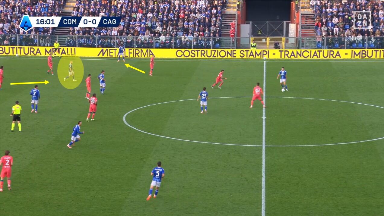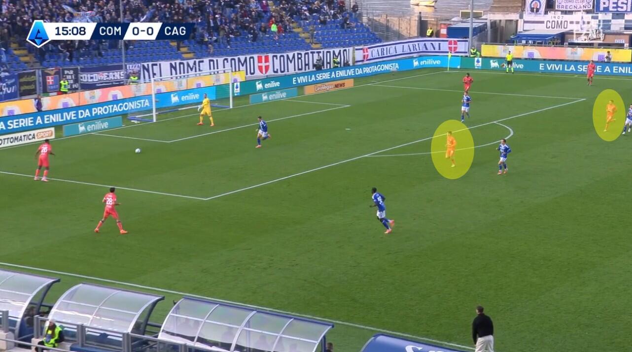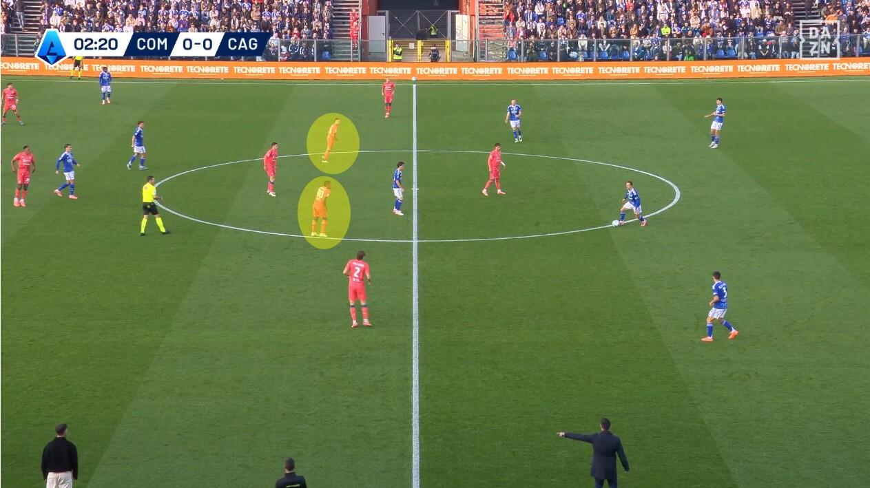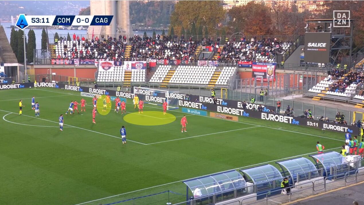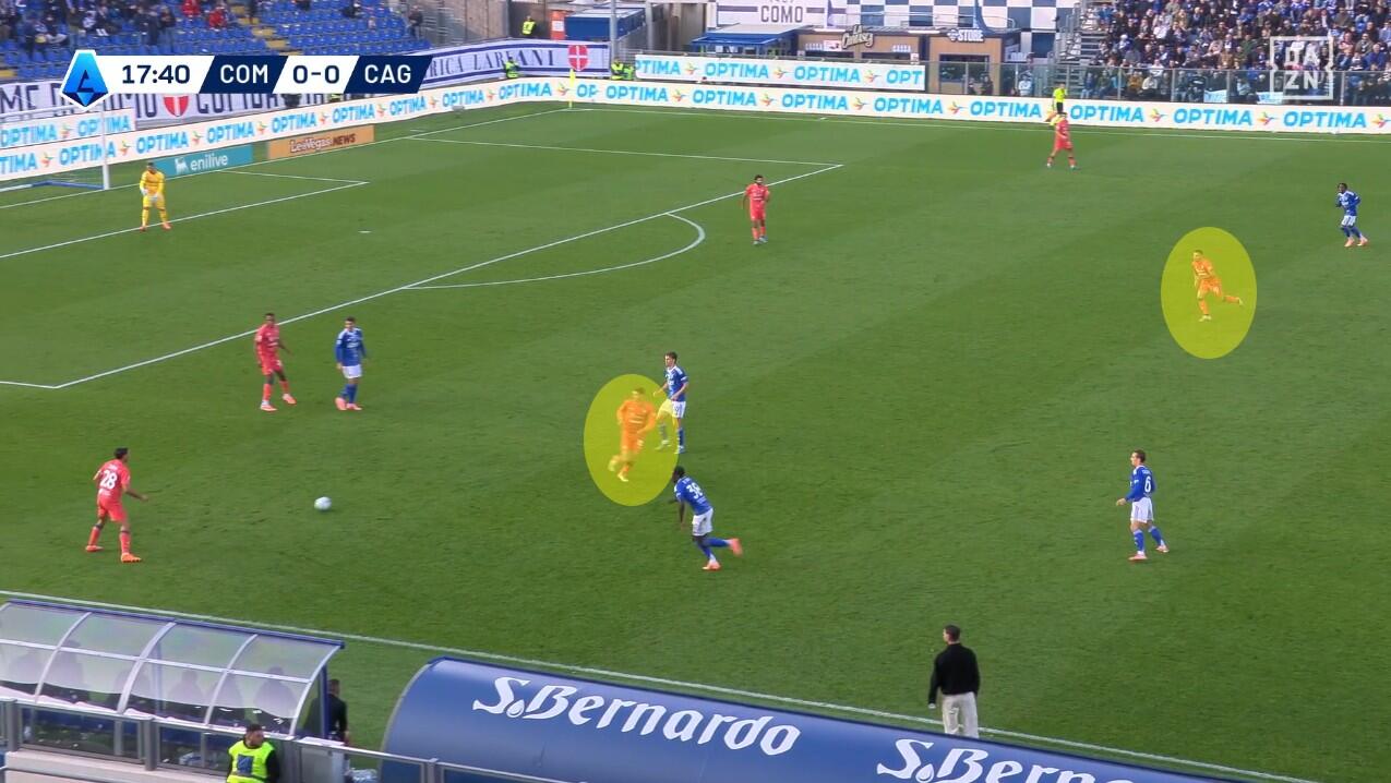 Lo schieramento in fase di non possesso del Cagliari è stato chiaro fin dai primi minuti. Con Prati come mediano al centro, sulla sua sinistra giostrava Gaetano e sulla sua destra Folorunsho. Per i due interni un triplo compito: la chiusura delle linee di passaggio, la pressione senza particolare aggressività dei registi e dei centrali di difesa del Como e, soprattutto, la creazione di densità difensiva quando la squadra di Fabregas provava a sfruttare le catene laterali.