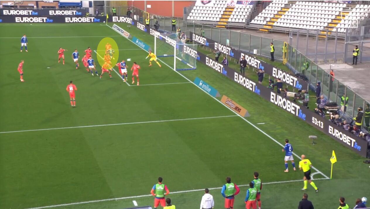 Sul lato opposto la strategia era praticamente identica, con l’unico cambiamento determinato dall’assenza di un riferimento per Luperto che, così, fungeva quasi da libero decentrato che andava in aiuto dei compagni a seconda della situazione specifica. Smolcic eseguiva movimenti del tutto simili a quelli di Valle, Felici e Obert interpretavano quanto visto con Palestra e Zappa sulla destra, ma con Luperto che andava maggiormente a occupare il mezzo spazio rispetto a quanto fatto da MIna orientato su Morata.