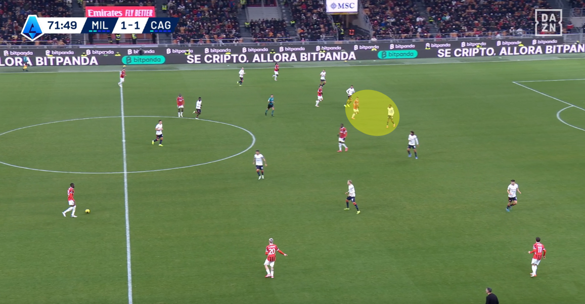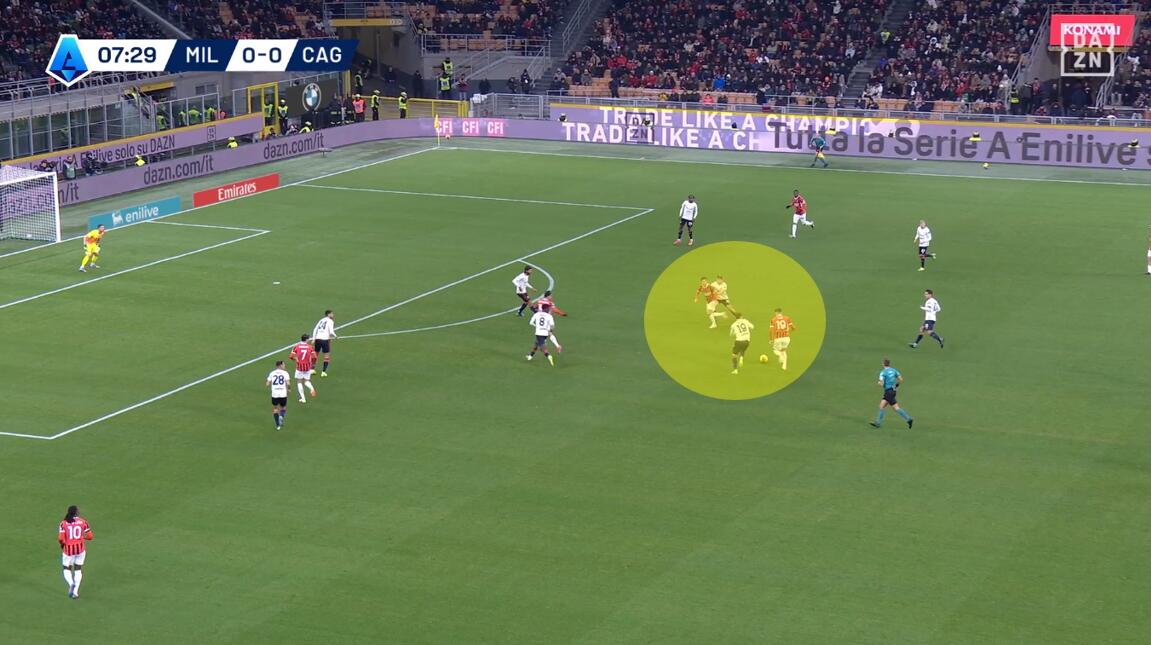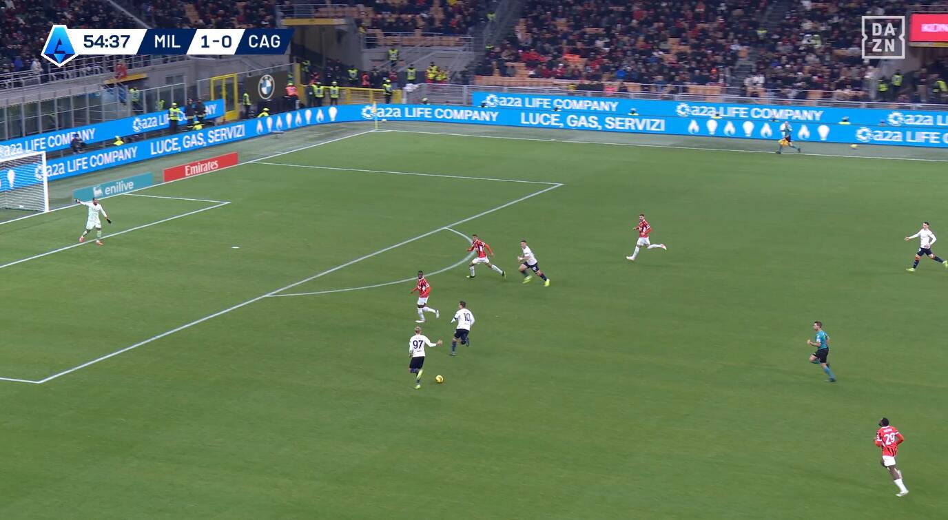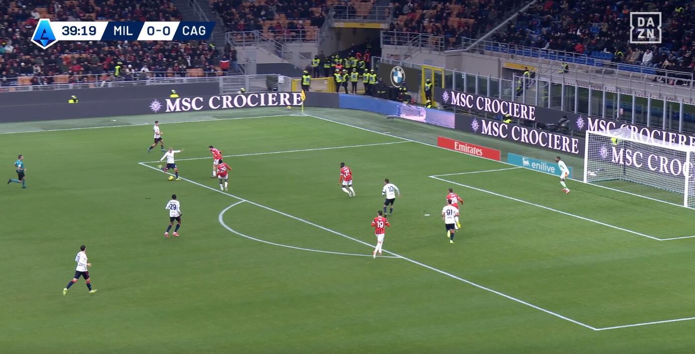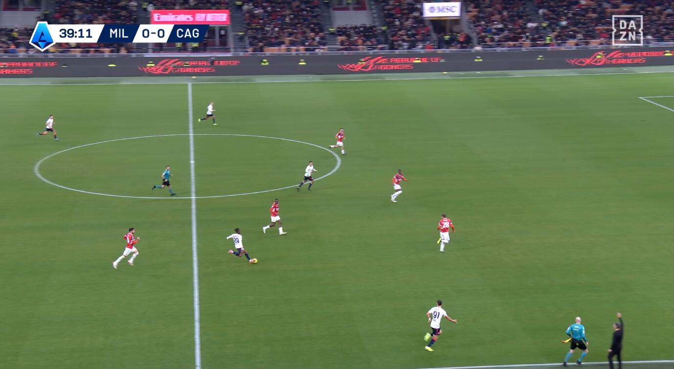 Tutto nasce da un tentativo forzato di Fofana di servire un compagno con un filtrante sul mezzo spazio alle spalle di Felici, con la difesa del Cagliari spostata più a protezione dell’area che a copertura dell’esterno. L’ex Feralpisalò, però, è bravo nel coprire la zona e chiudere la linea verticale, intercettando la palla giocata da Fofana e ripartendo palla al piede in velocità. Il centrocampista rossonero perde tempo reagendo all’errore per poi evitare di compiere fallo forse perché sotto diffida.