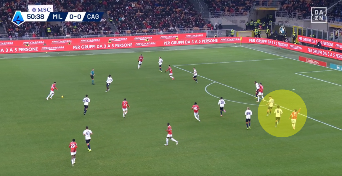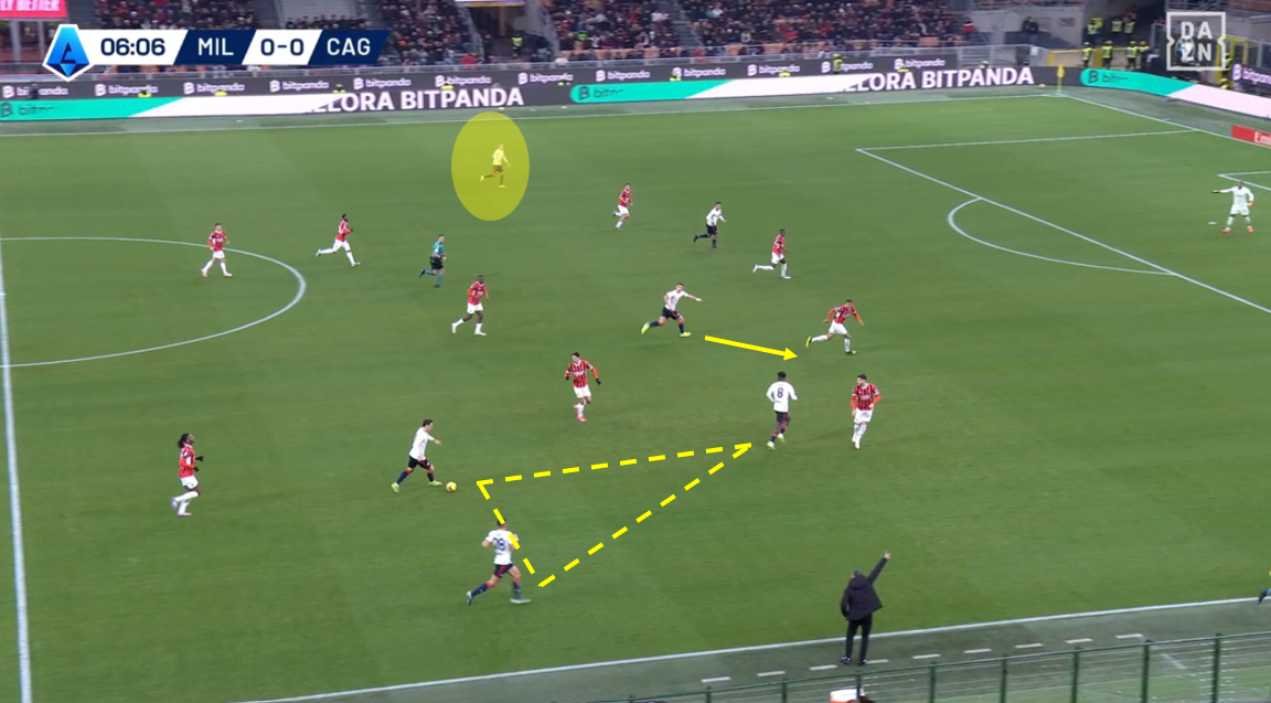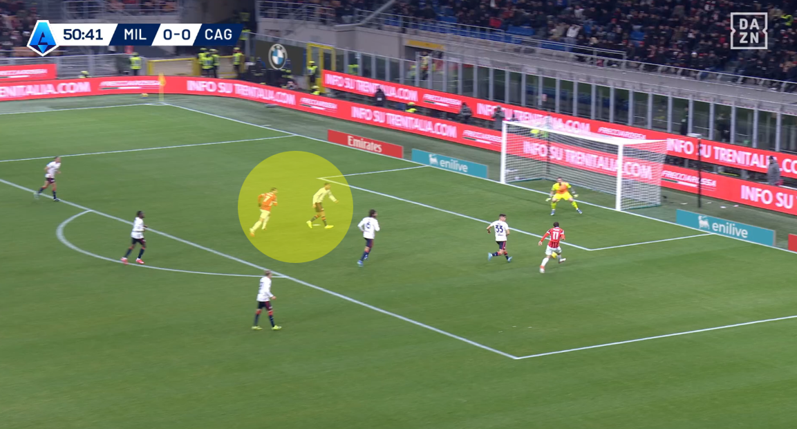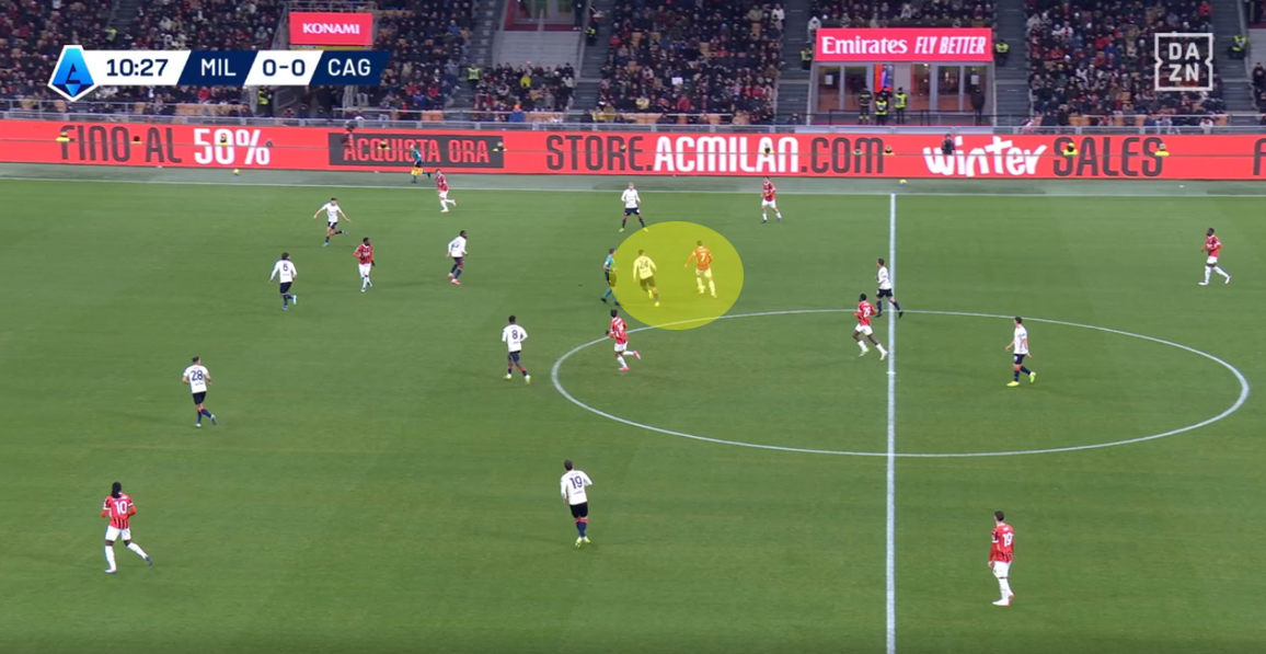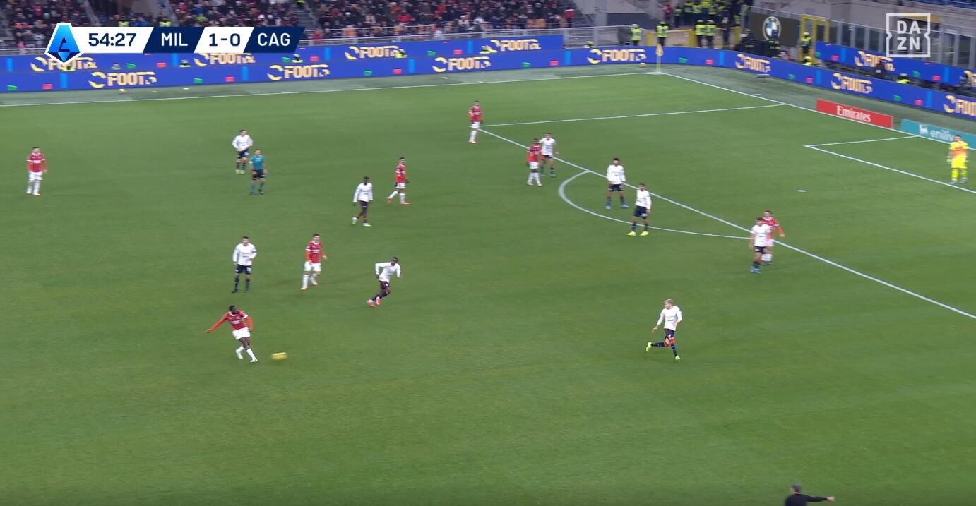 Tutto nasce da un tentativo forzato di Fofana di servire un compagno con un filtrante sul mezzo spazio alle spalle di Felici, con la difesa del Cagliari spostata più a protezione dell’area che a copertura dell’esterno. L’ex Feralpisalò, però, è bravo nel coprire la zona e chiudere la linea verticale, intercettando la palla giocata da Fofana e ripartendo palla al piede in velocità. Il centrocampista rossonero perde tempo reagendo all’errore per poi evitare di compiere fallo forse perché sotto diffida.