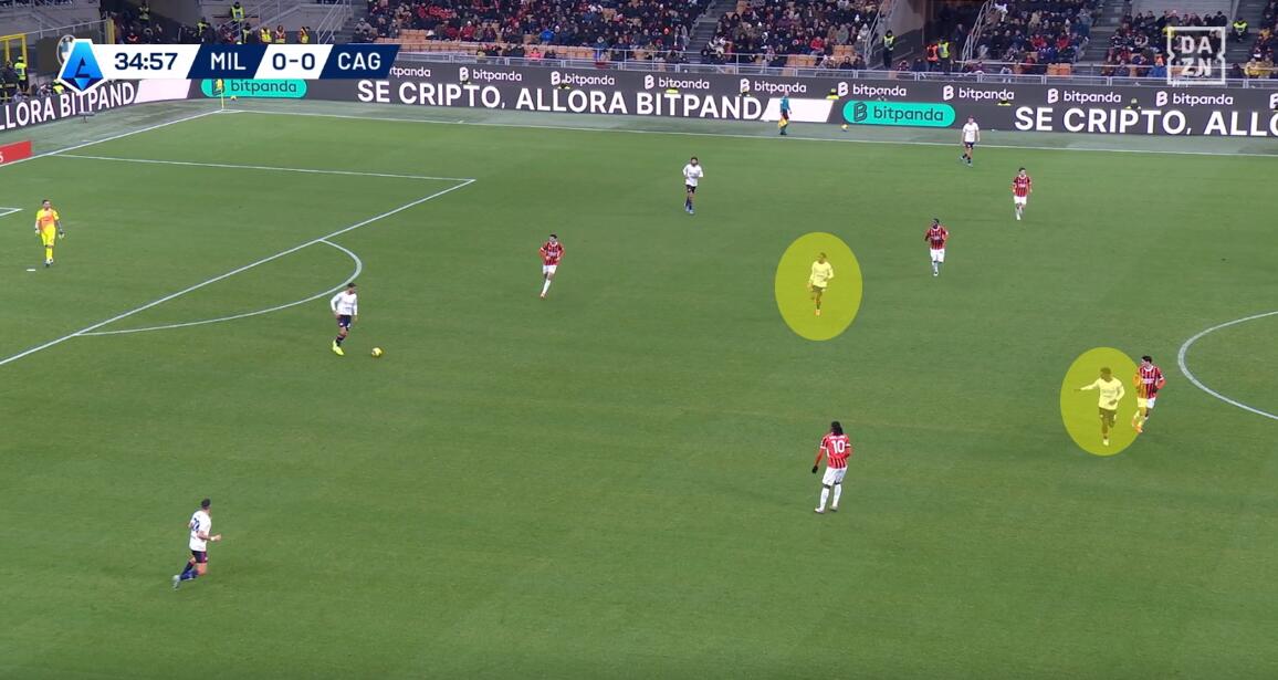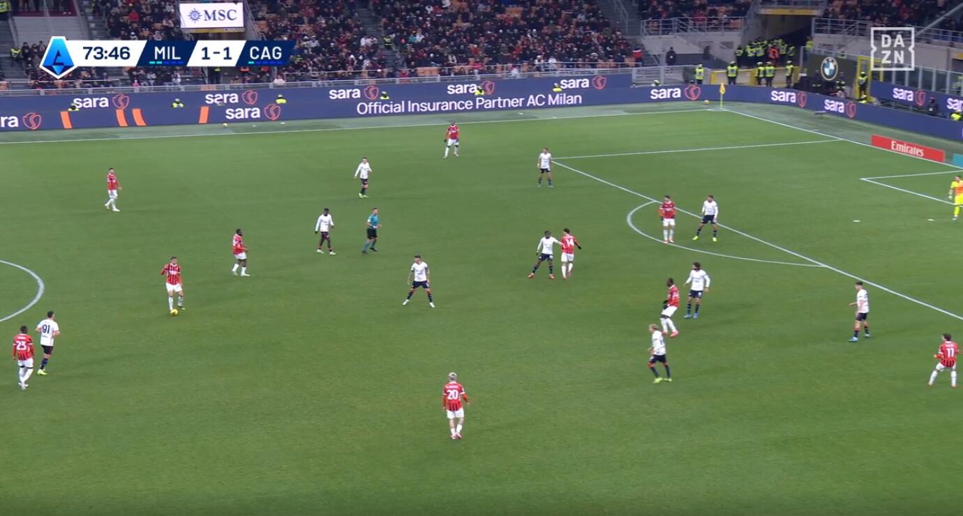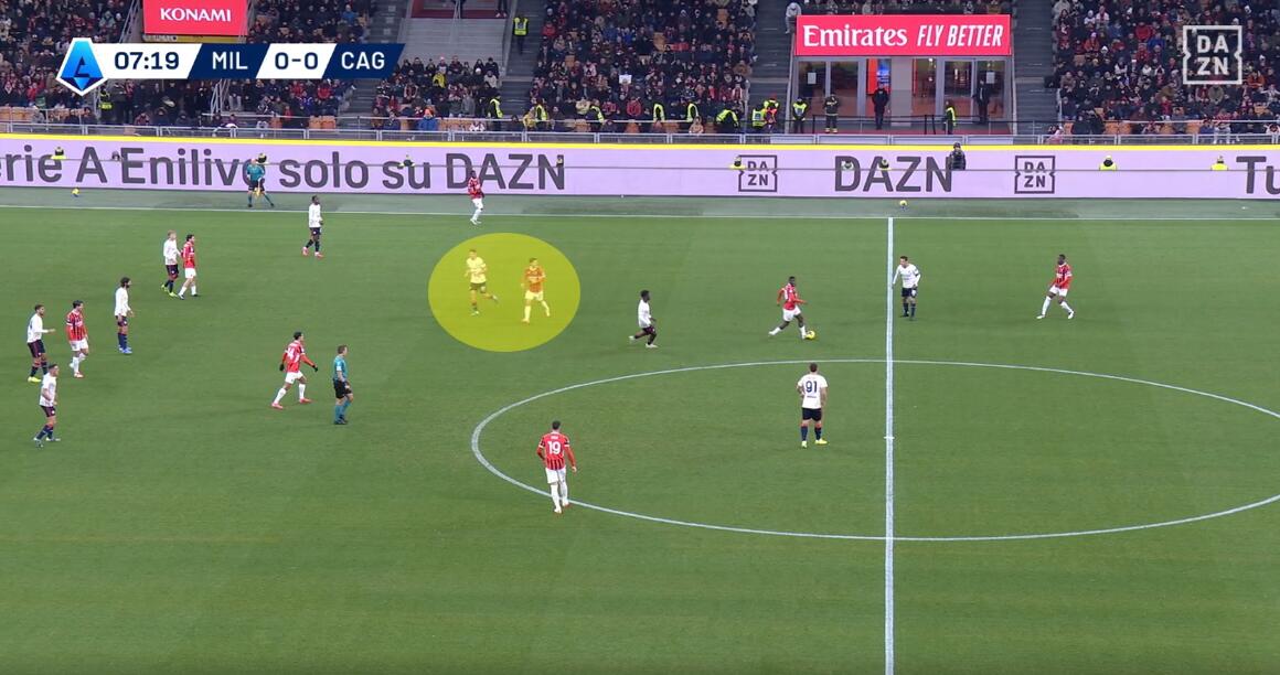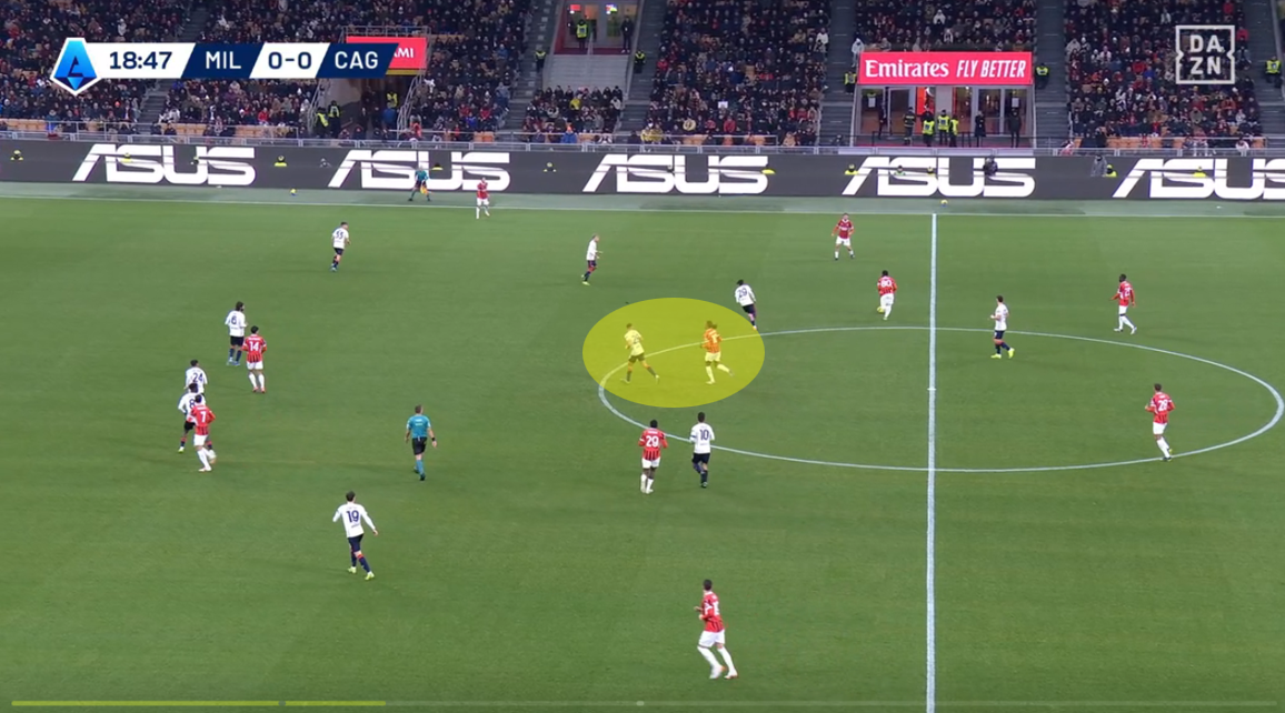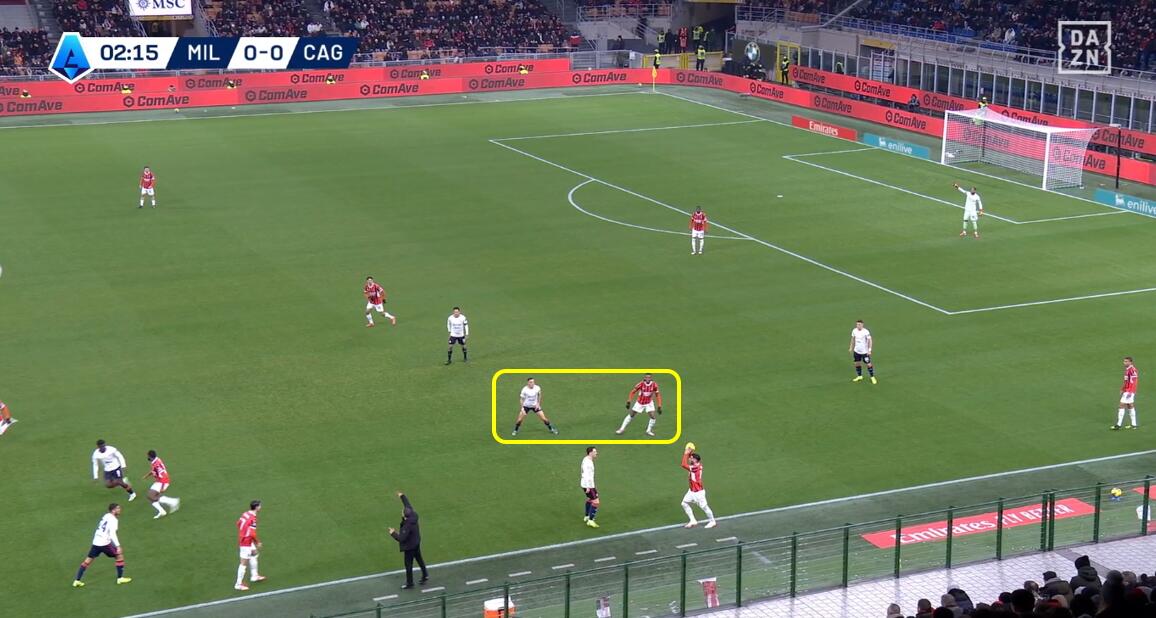 L’esempio dell’unione di attesa iniziale e pressione uomo su uomo una volta che il Milan arrivava nella metà campo del Cagliari è data dalla costante rottura della linea difensiva da parte degli interpreti. Dal 4-4-2 di base si passava al 6-2-2 in fase di non possesso per poi trasformarsi in un 4-2-2-2 in possesso, ma senza che i numeri significassero posizioni ferme e nette. Tutto è dipeso dai movimenti degli avversari, con accoppiamenti difensivi chiari e senza quasi mai lasciare spazio a scalate nelle marcature.