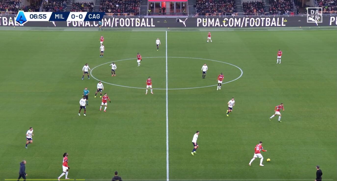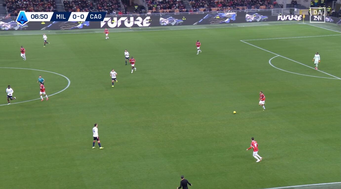 L’allenatore rossoblù, al contrario che in altre occasioni, ha completamente rinunciato alla prima pressione. La scelta è stata quella di lasciare impostare il Milan dal basso per due motivi: il primo le capacità tecniche di Maignan, libero di ricevere e scegliere la giocata, ma allo stesso tempo con il Cagliari che copriva sia linee di passaggio medio-lunghe sia gli uomini passibili ricezione del pallone; il secondo la necessità di restare corti e non aprire spazi alle incursioni centrali di Theo Hernandez e alle combinazioni del francese con Leao, oltre ai movimenti senza palla di Reijnders e ai tagli orizzontali di Pulisic.