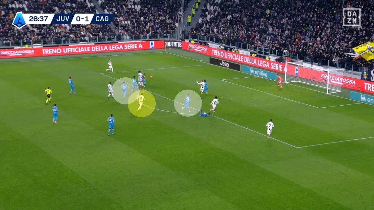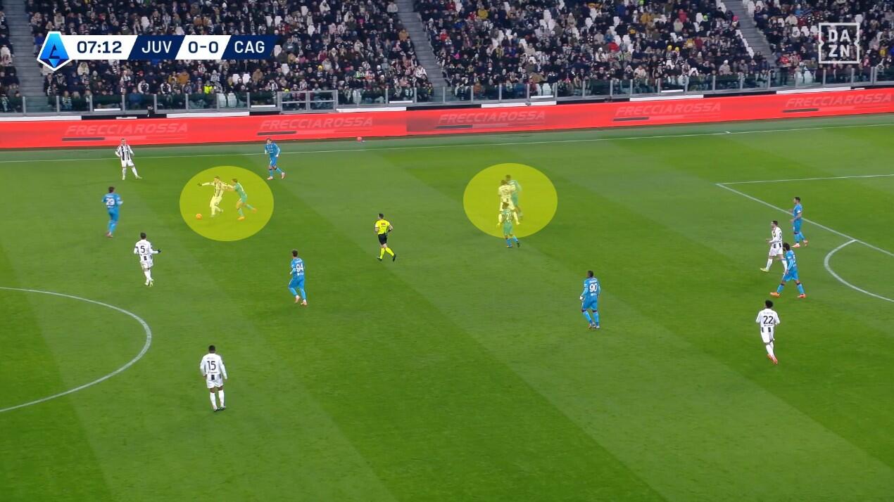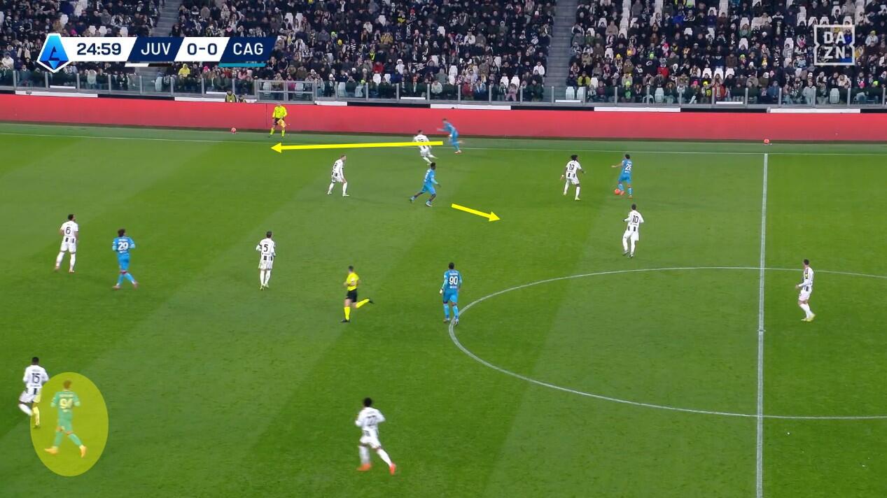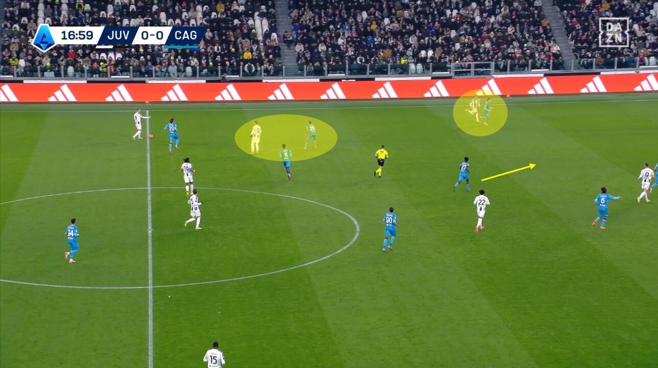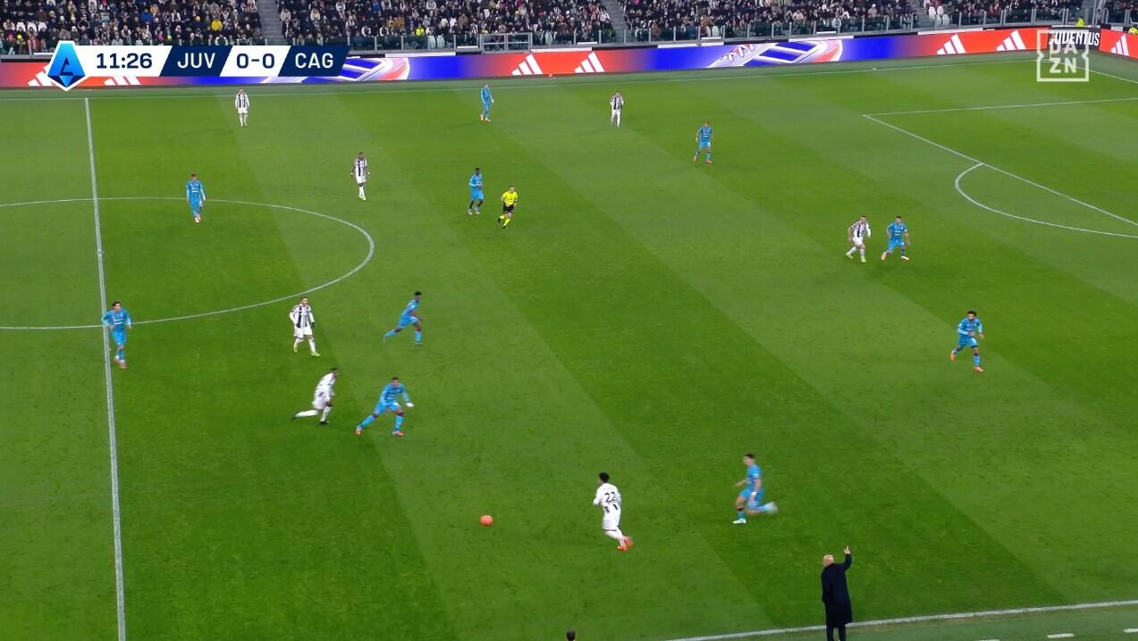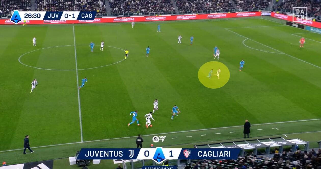 Non appena Kalulu riceve palla e parte in conduzione verso la trequarti, sono ben quattro i giocatori del Cagliari intorno a lui. Due a inseguire (Esposito e Folorunsho) e due a coprire la mediana (Adopo e Obert), con Thuram che ha spazio alla sinistra di Kalulu per attaccare il mezzo spazio. In questo contesto, giustamente, Zappa è pronto a rompere la linea per restare su Yildiz come fatto fino a quel momento della gara.