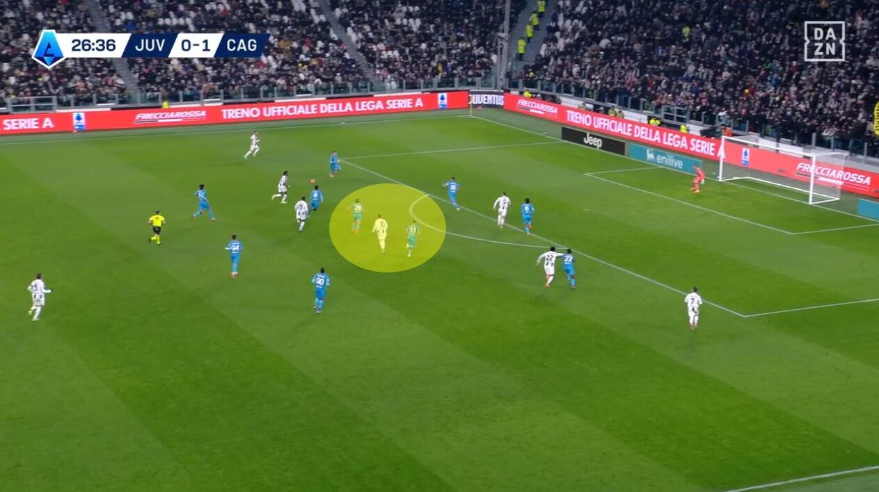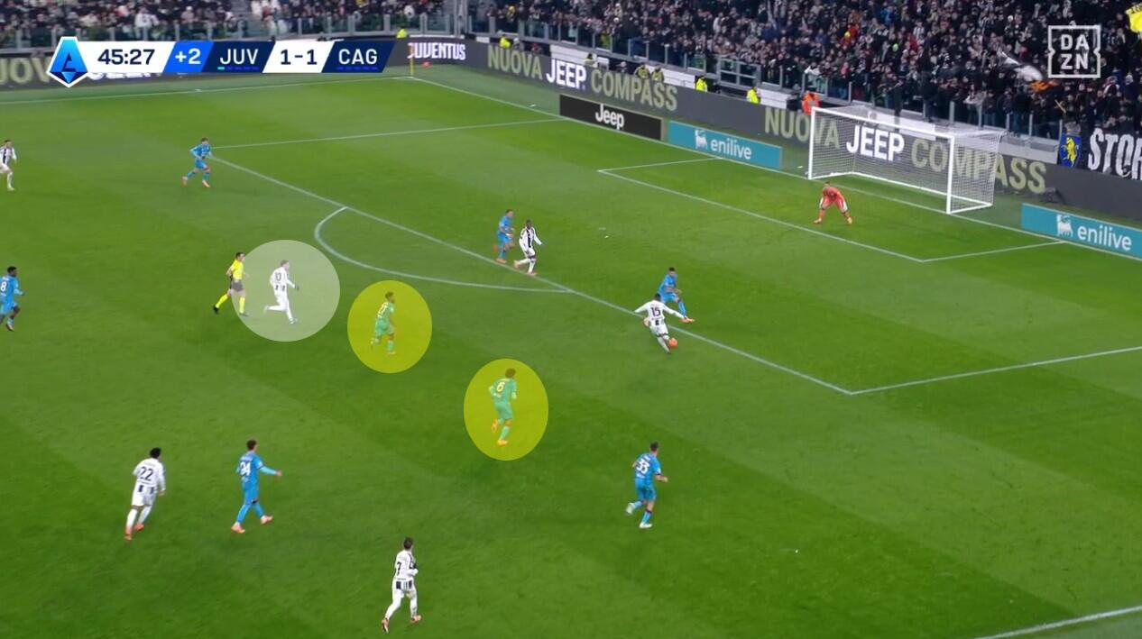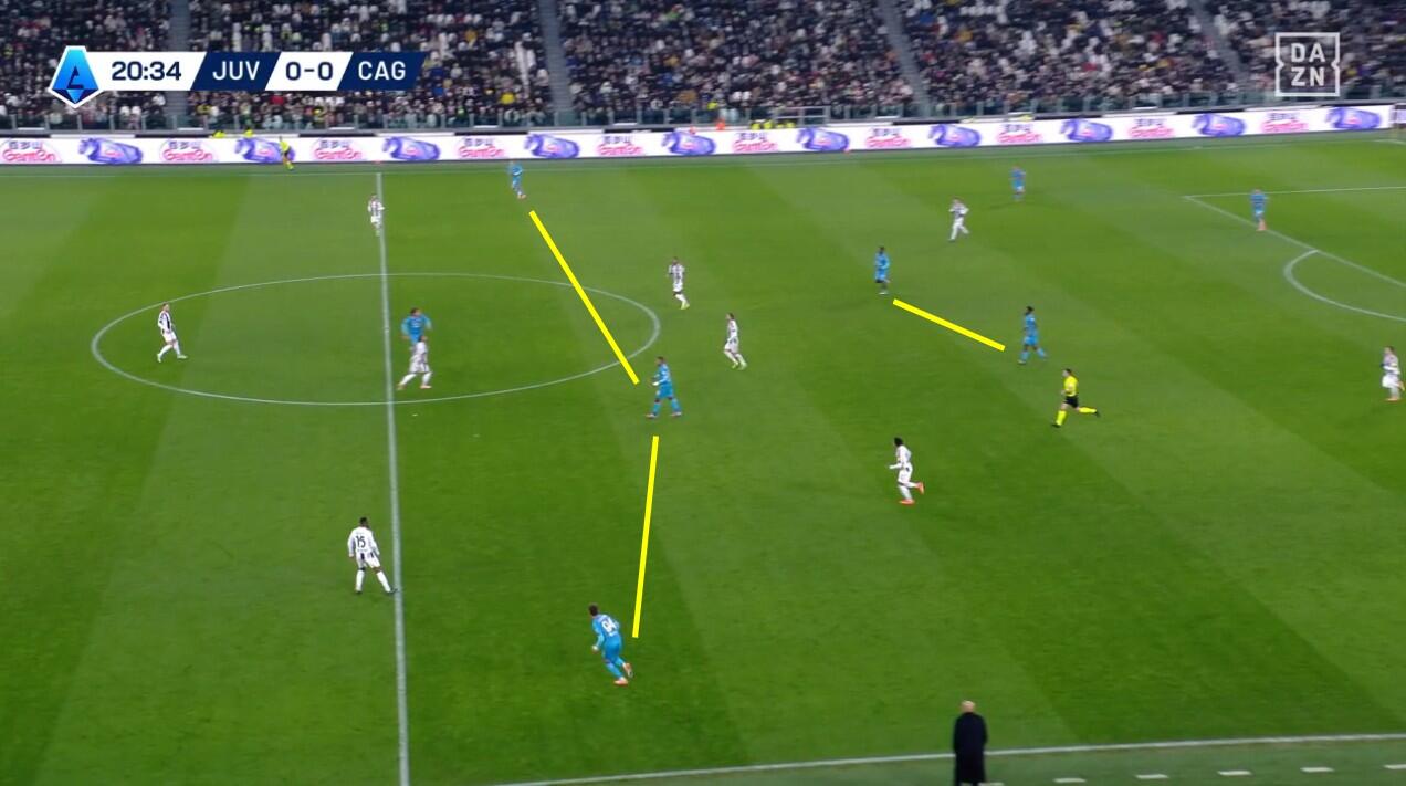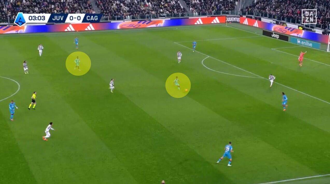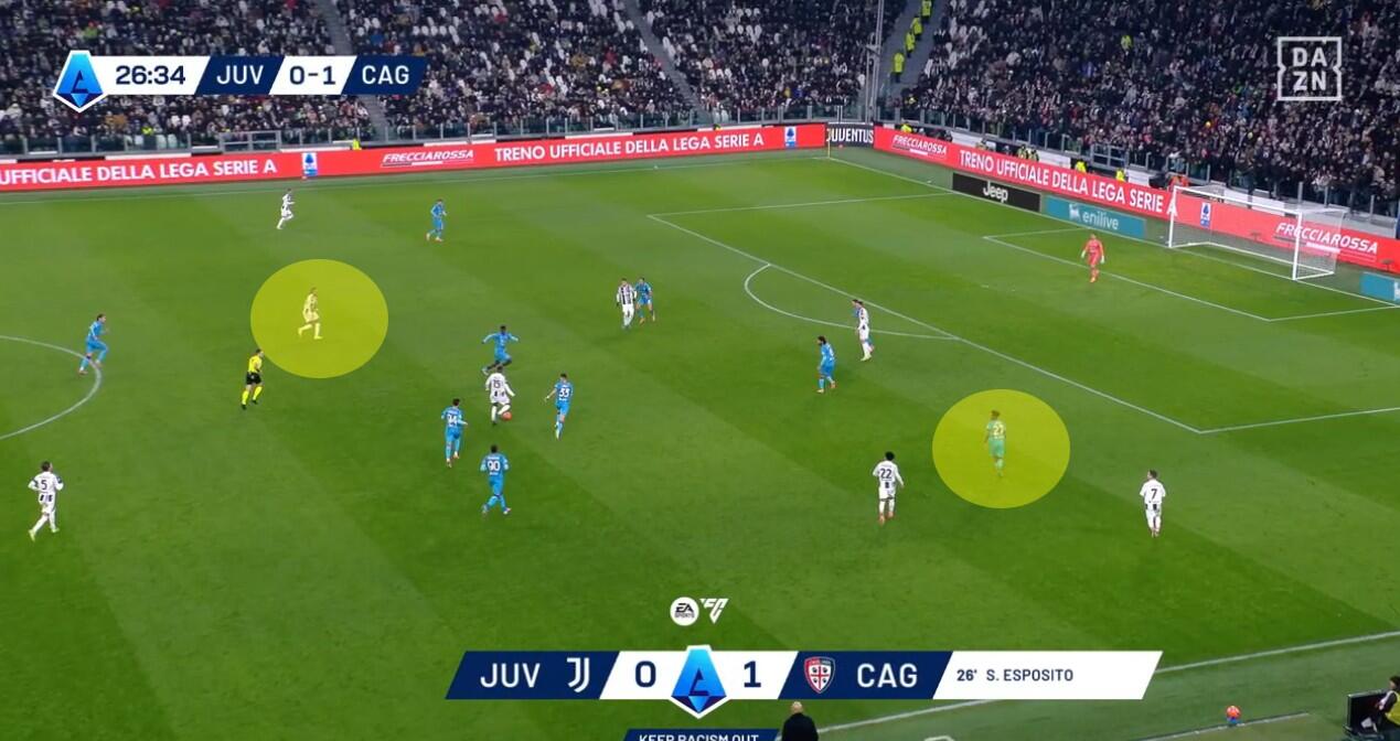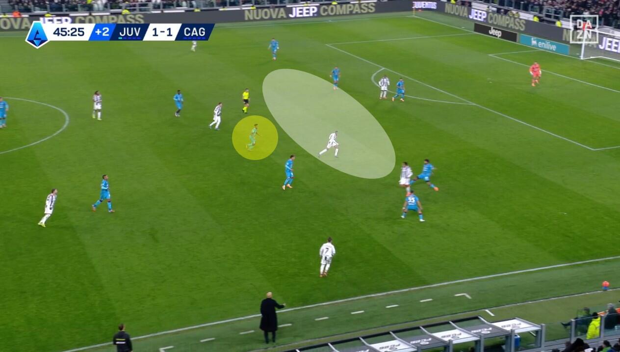 Non appena Kalulu riceve palla e parte in conduzione verso la trequarti, sono ben quattro i giocatori del Cagliari intorno a lui. Due a inseguire (Esposito e Folorunsho) e due a coprire la mediana (Adopo e Obert), con Thuram che ha spazio alla sinistra di Kalulu per attaccare il mezzo spazio. In questo contesto, giustamente, Zappa è pronto a rompere la linea per restare su Yildiz come fatto fino a quel momento della gara.