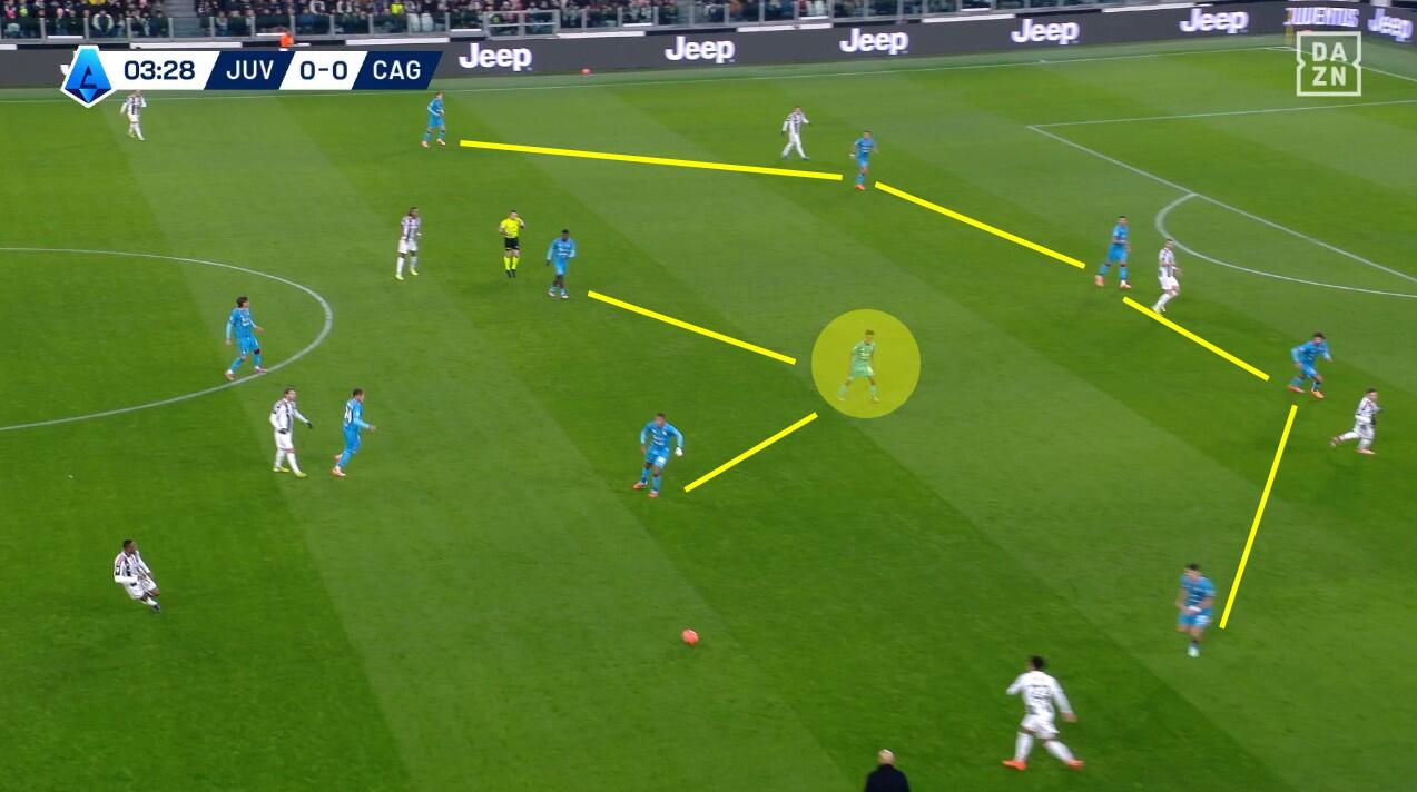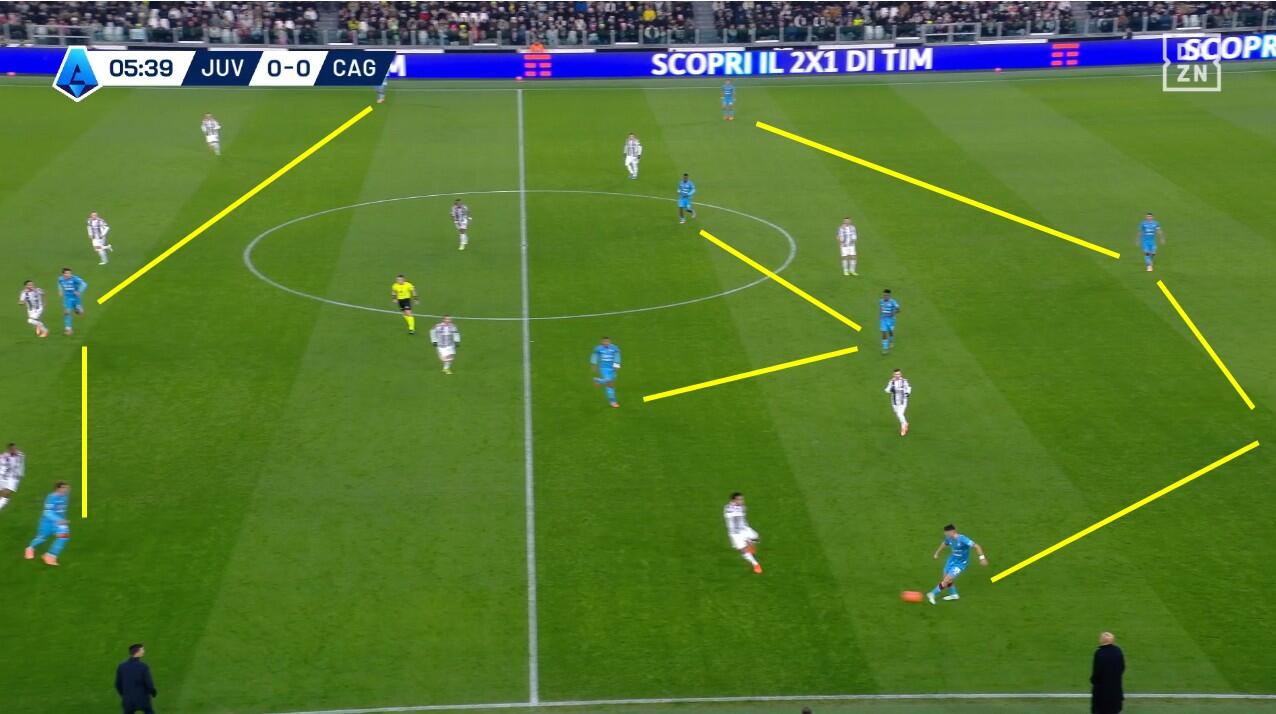 La costante è stata comunque quella di un 5-3-2 che puntava a coprire lo spazio in orizzontale per schermare l’attacco della Juventus. Difficile fare altrimenti, perché i bianconeri riempivano i cinque corridoi verticali partendo dal duo Kostic-Yildiz sul lato sinistro d’attacco – a volte il terzino restava esterno con Yildiz sul mezzo spazio, altre viceversa – e passando per Vlahovic (e poi David) come riferimento centrale, quindi McKennie e Conceicao sulla stessa falsariga dei compagni sul lato opposto, con l’americano più spesso nel mezzo spazio e il portoghese largo. Rispetto al 4-4-2, dunque, la difesa del Cagliari portava Zappa come braccetto su Yildiz, Palestra scivolava come quinto basso per seguire Kostic, Deiola centrale di difesa sul centravanti con Luperto alla sua sinistra su McKennie e, infine, Obert come quinto su Conceicao. Compiti e posizione fondamentali quelli di Liteta che, davanti alla difesa, agiva da equilibratore senza una marcatura specifica assegnata, ma piuttosto con l’idea di schermare la zona di rifinitura bianconera e spostarsi sul mezzo spazio a seconda della posizione del possesso della Juventus.