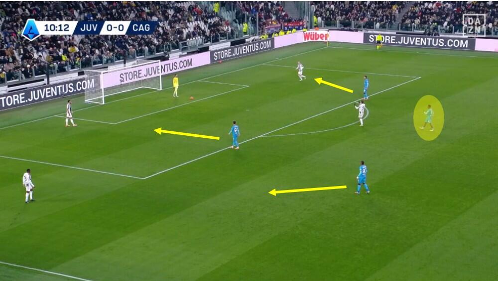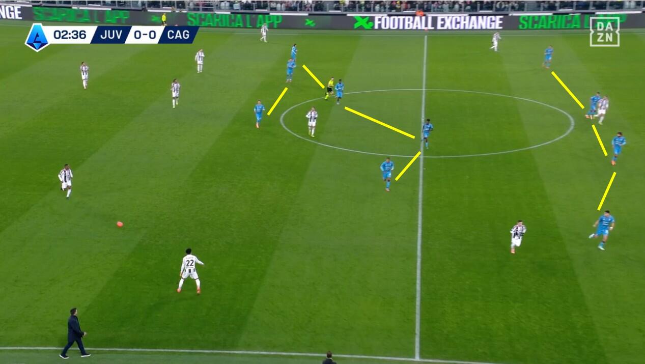 Quando possibile il Cagliari provava ad alzare la pressione sulla costruzione dal basso avversaria e, in questo tipo di situazione, ecco che Liteta si alzava a uomo su Locatelli accorciando sul regista bianconero mentre Folorunsho, Esposito e Borrelli si occupavano del trio difensivo juventino. Una soluzione che, una volta che la Juventus superava la pressione, portava alcuni scompensi nella struttura difensiva non appena i bianconeri riuscivano a portare palla verso la metà campo del Cagliari.